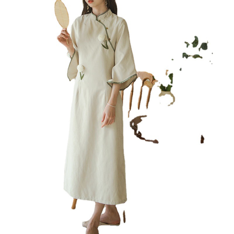 娅妮甄选 夏季新款改良旗袍日常立体花苞刺绣国风连衣裙新中