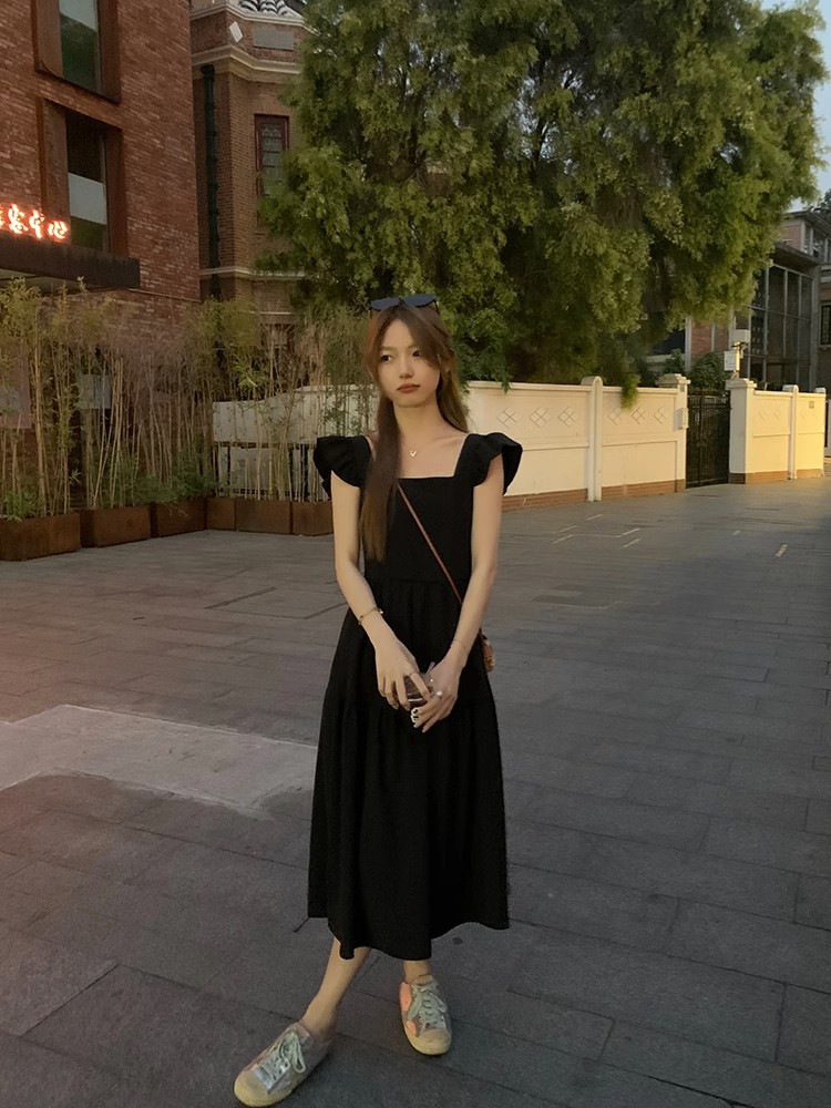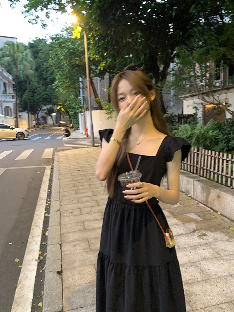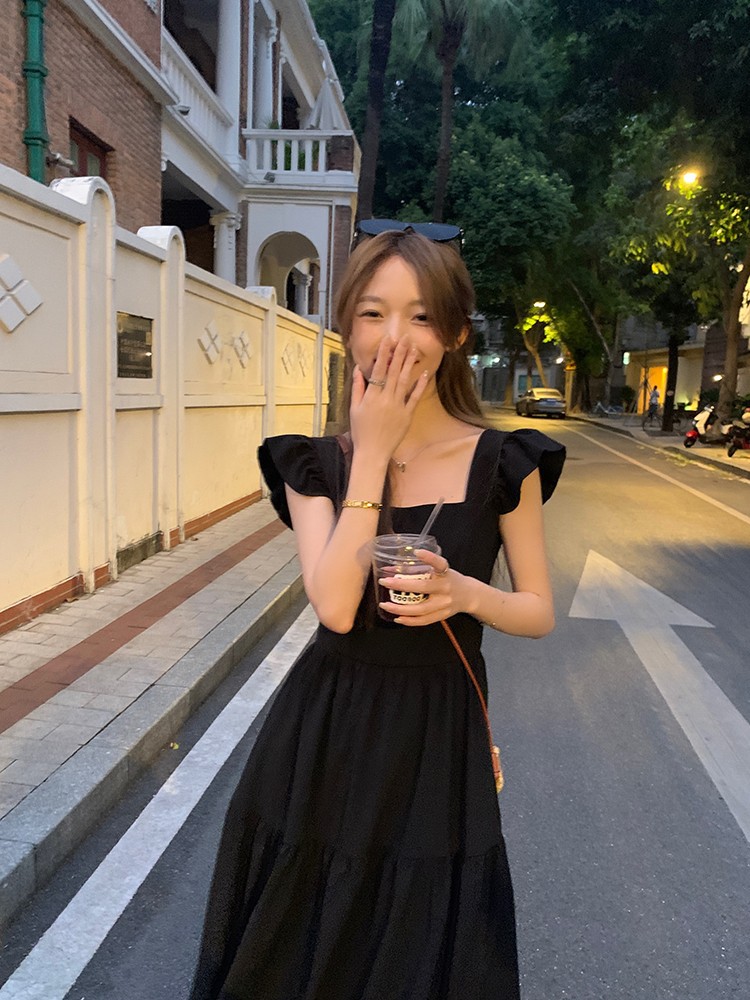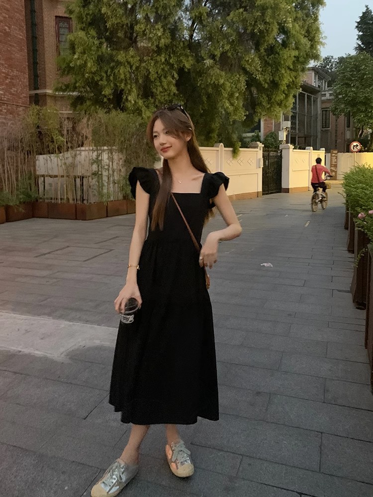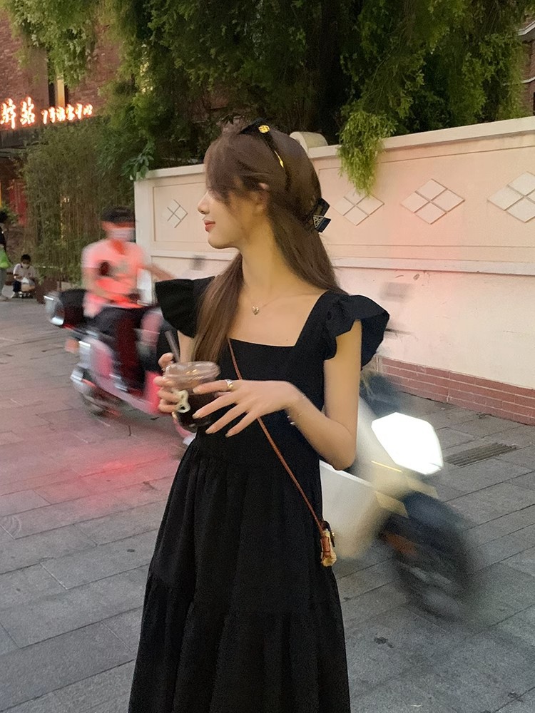 方领黑色小飞袖连衣裙女装夏季法式复古高级感气质收腰显瘦小裙子