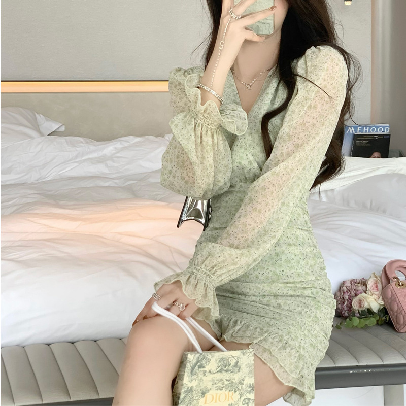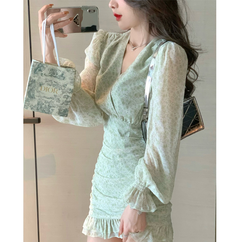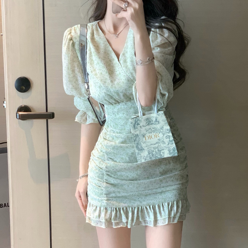 夏季女装年新款高级感茶歇法式气质绿色碎花连衣裙小众设计