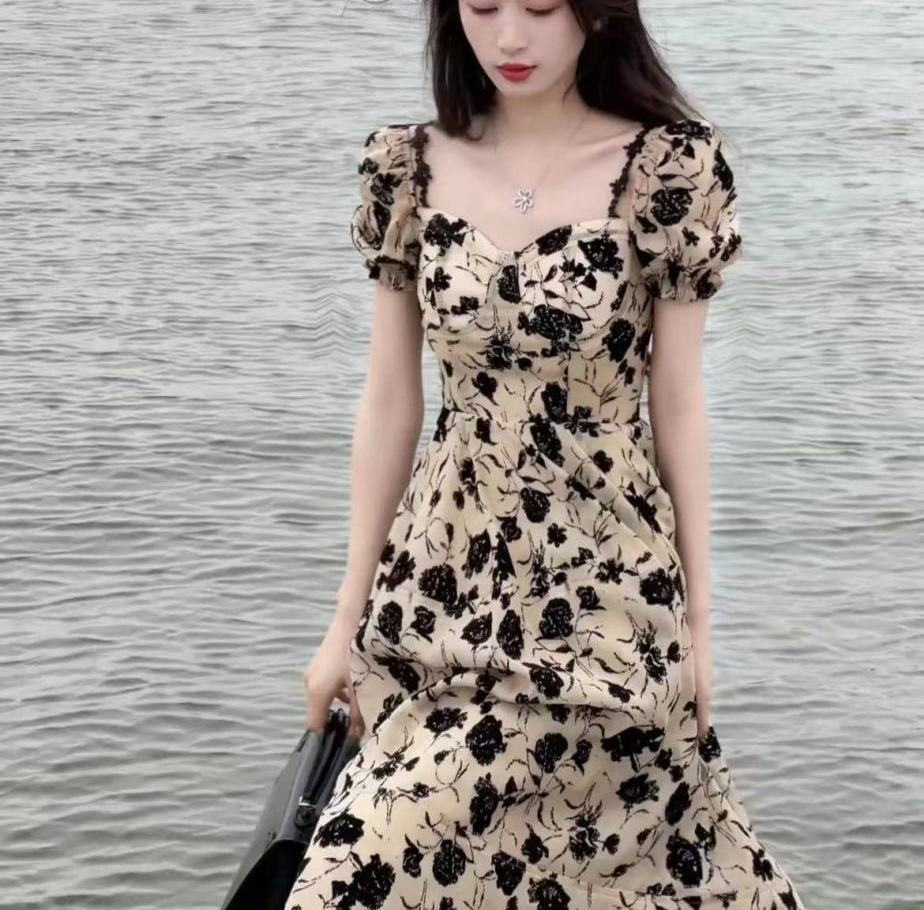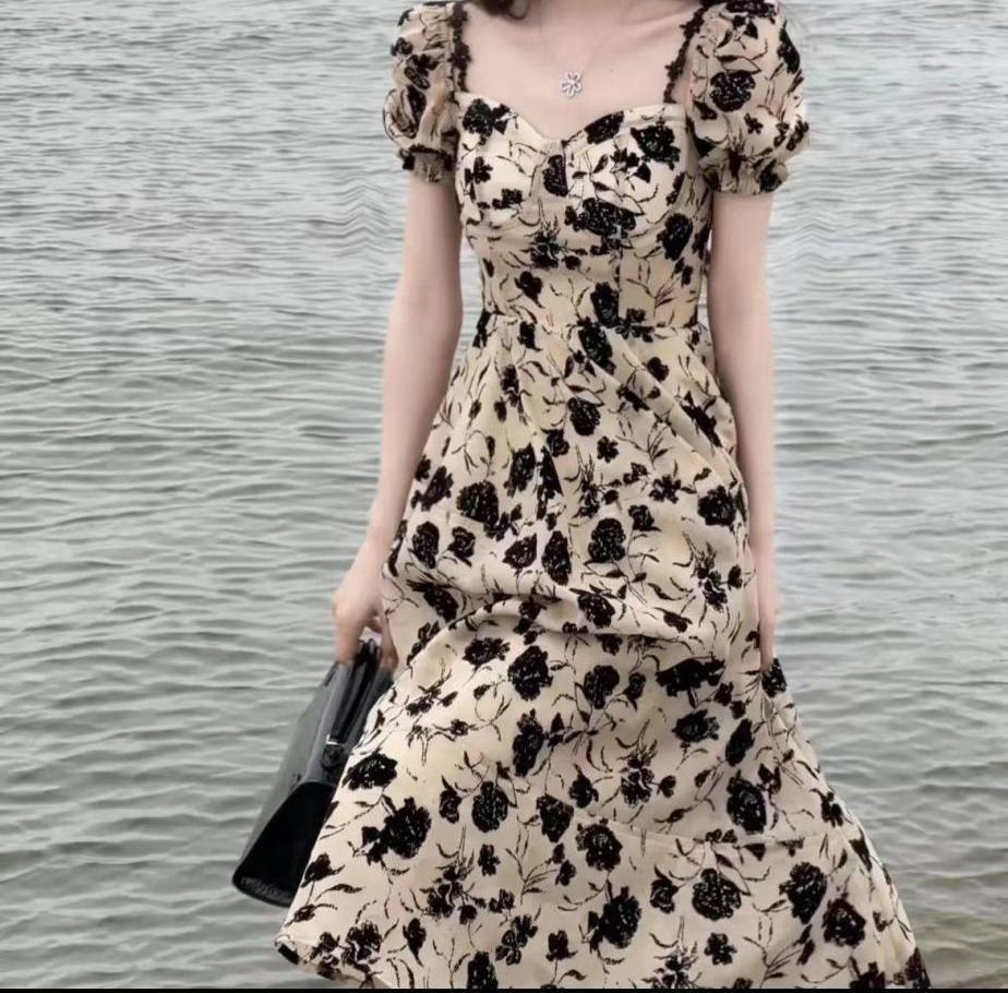 黑色碎花连衣裙年新款女装小个子法式茶歇收腰高级感夏季玫瑰