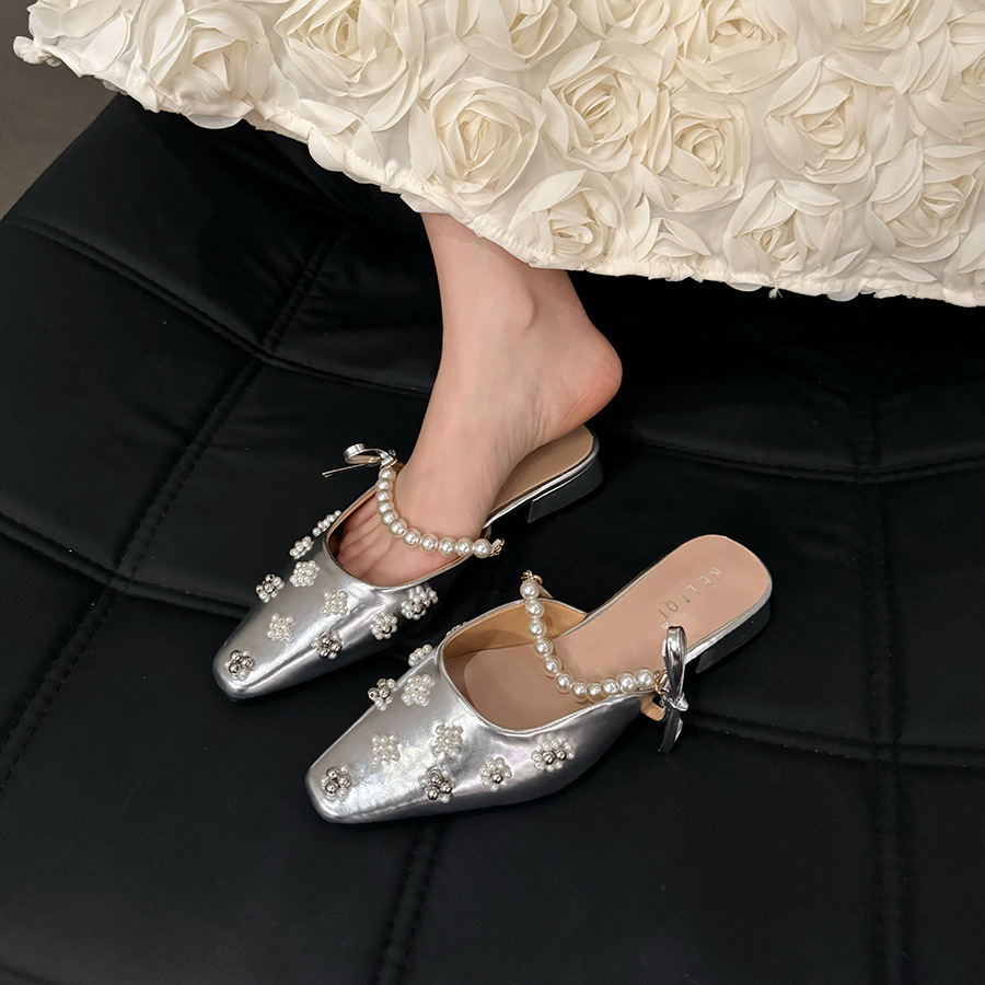 法式晚晚配裙包头半拖女外穿夏季新款珍珠高跟银色绝美凉鞋