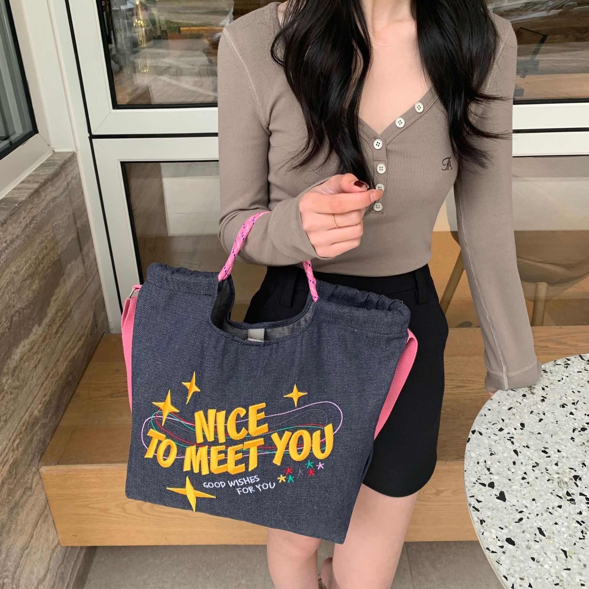 新款文艺简约百搭牛仔斜挎手提肩带可调节学生发泡印花单肩包