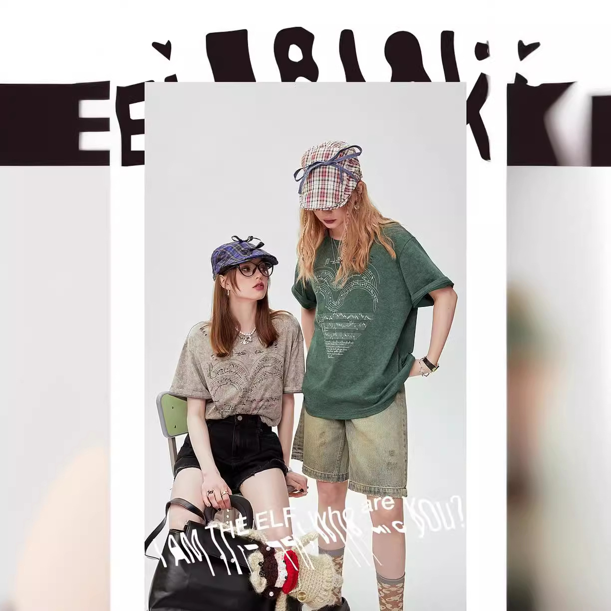 新款星星刺绣牛仔裤男士潮牌美式高街复古做旧高街阔腿长裤子