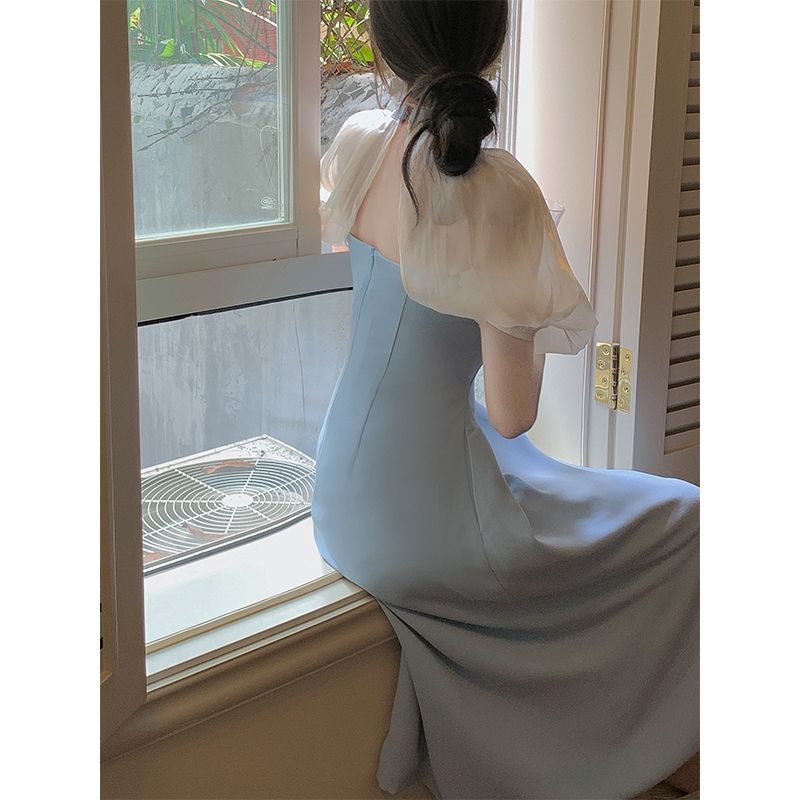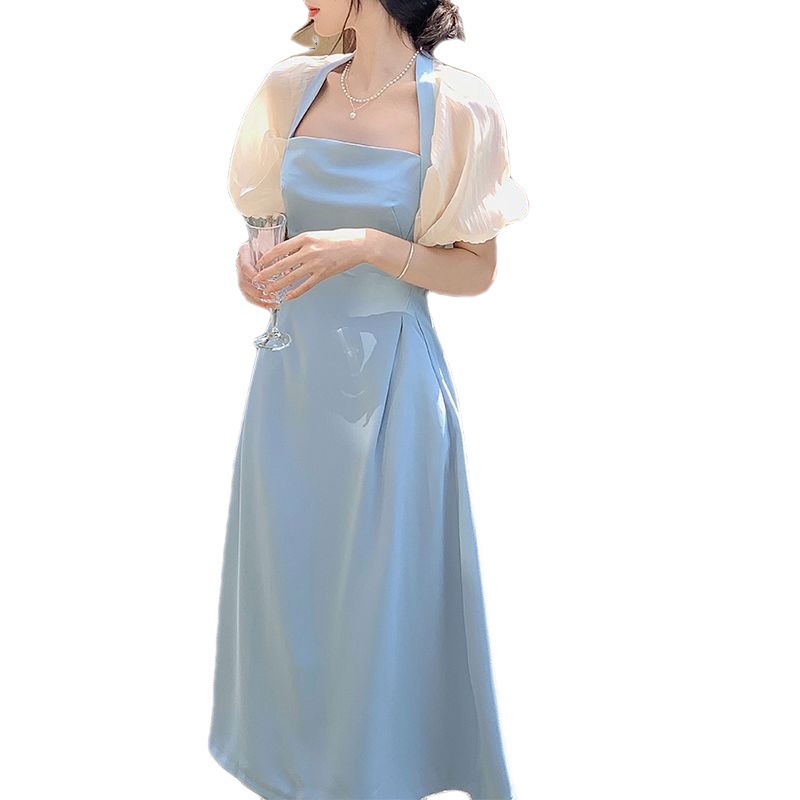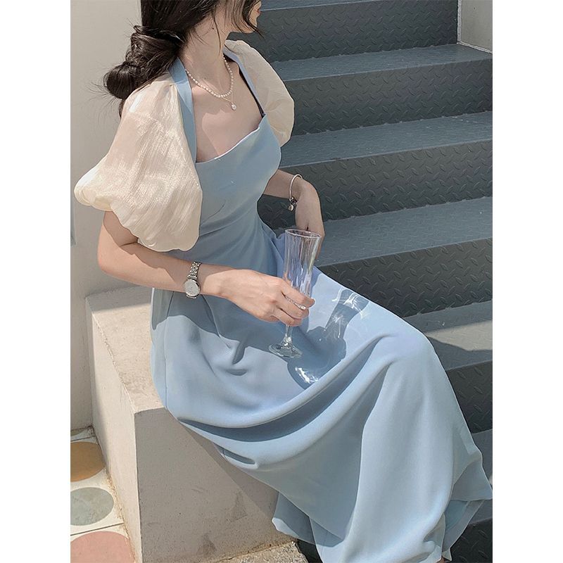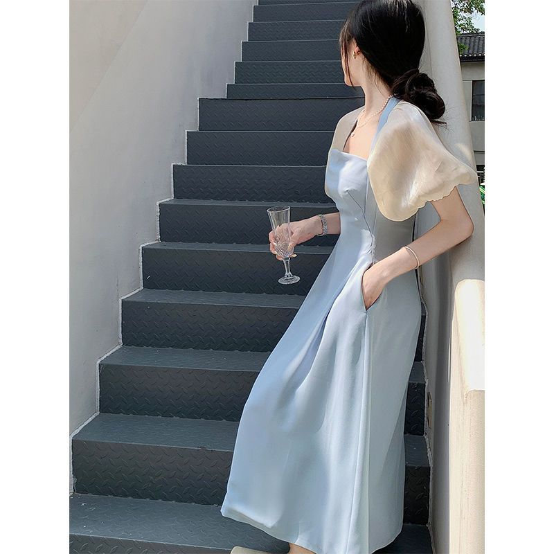 法式艺术感轻奢赫本风高级感复古气质修身蓝色方领连衣裙子女夏季