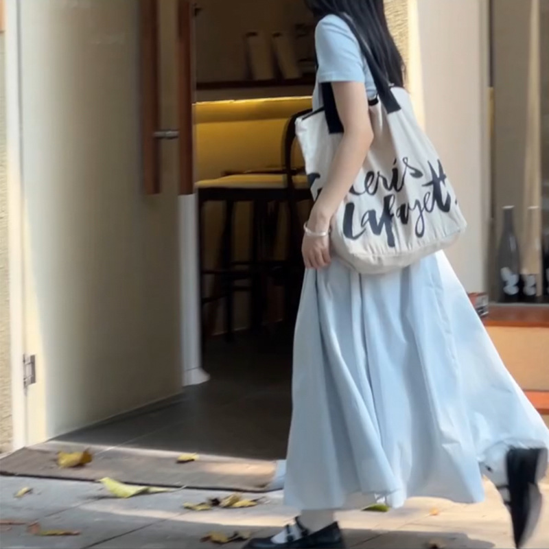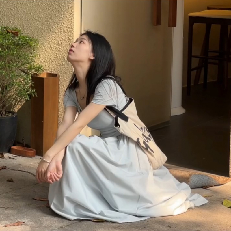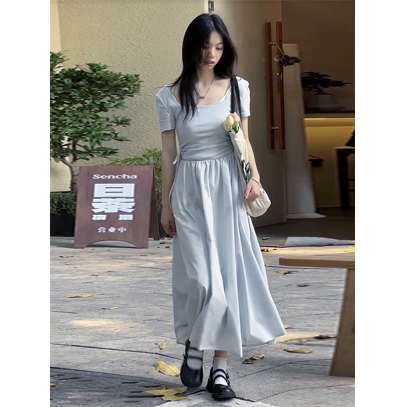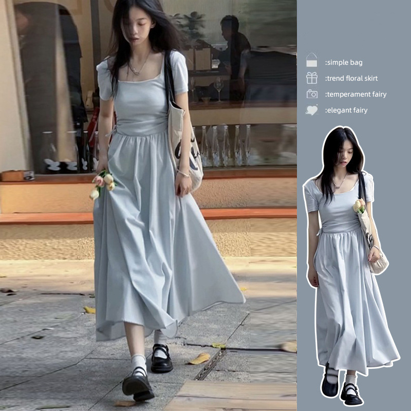 赫本风法式方领短袖蓝色连衣裙女夏季新款长裙高级感显瘦裙子