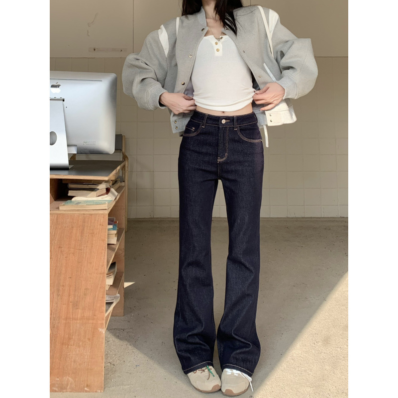 深蓝色马蹄长裤直筒牛仔裤女秋季新款修身拖地微喇裤