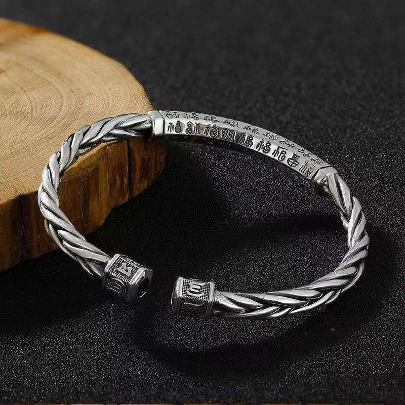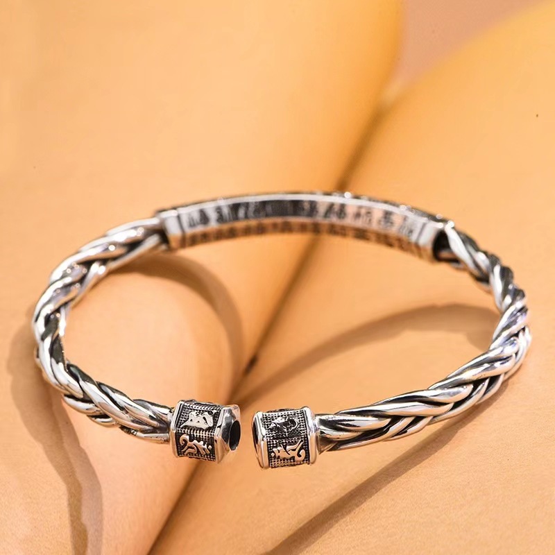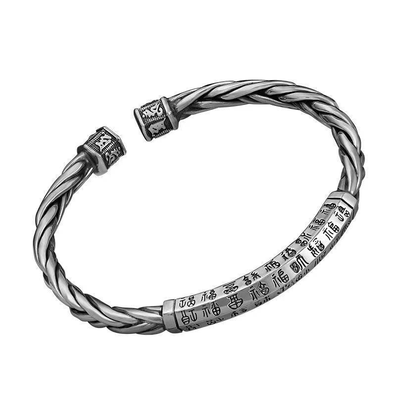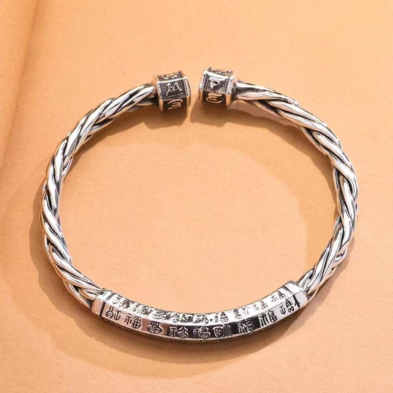 复古六字真言银手镯开口麻花银手镯男百福女士编织银镯子