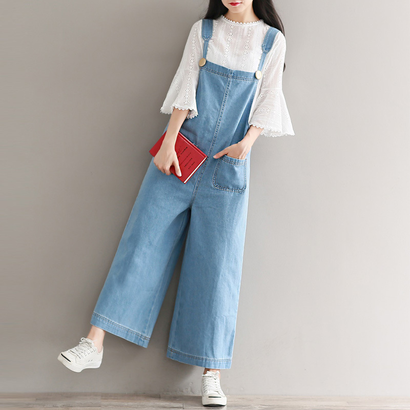 大码背带裤显瘦牛仔春夏女宽松韩版胖百搭学生九分阔腿裤学院风
