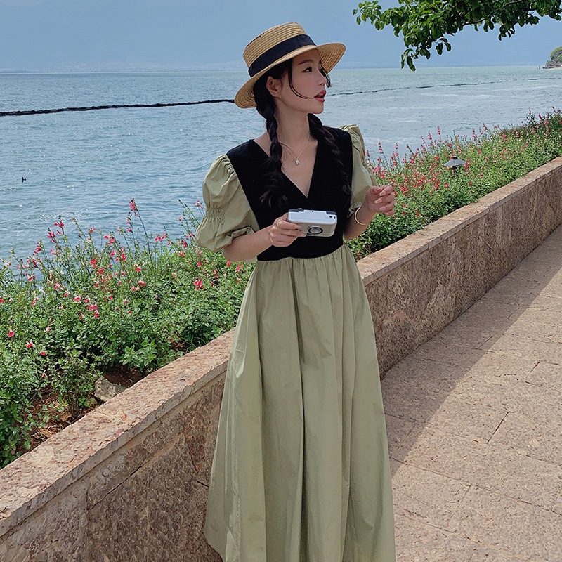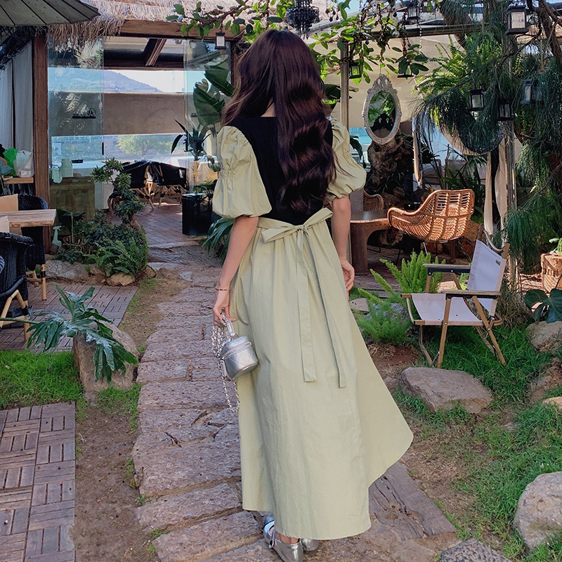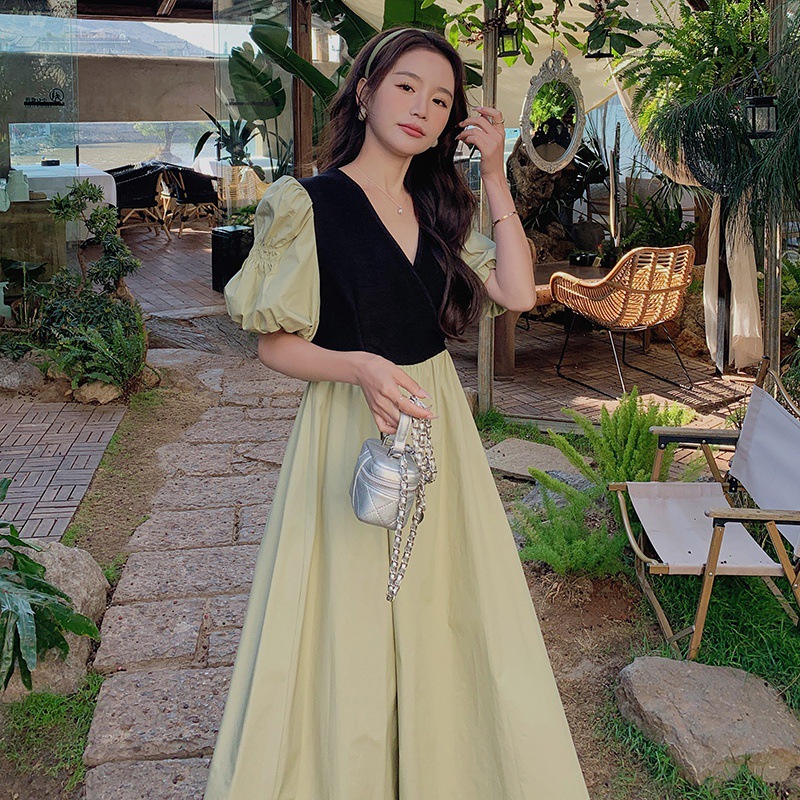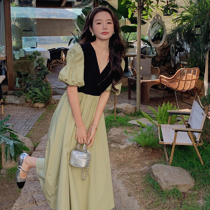 实拍撞色连衣裙女夏季新款法式复古小众设计高级感小个子长裙