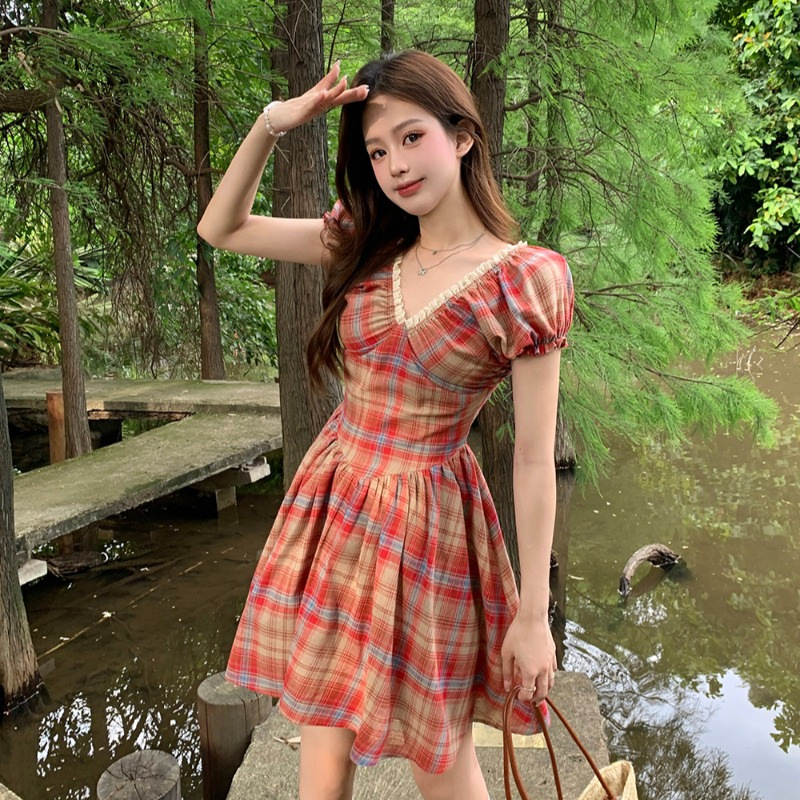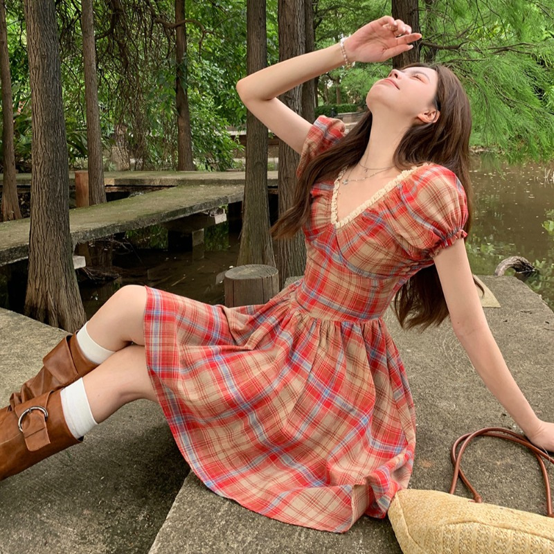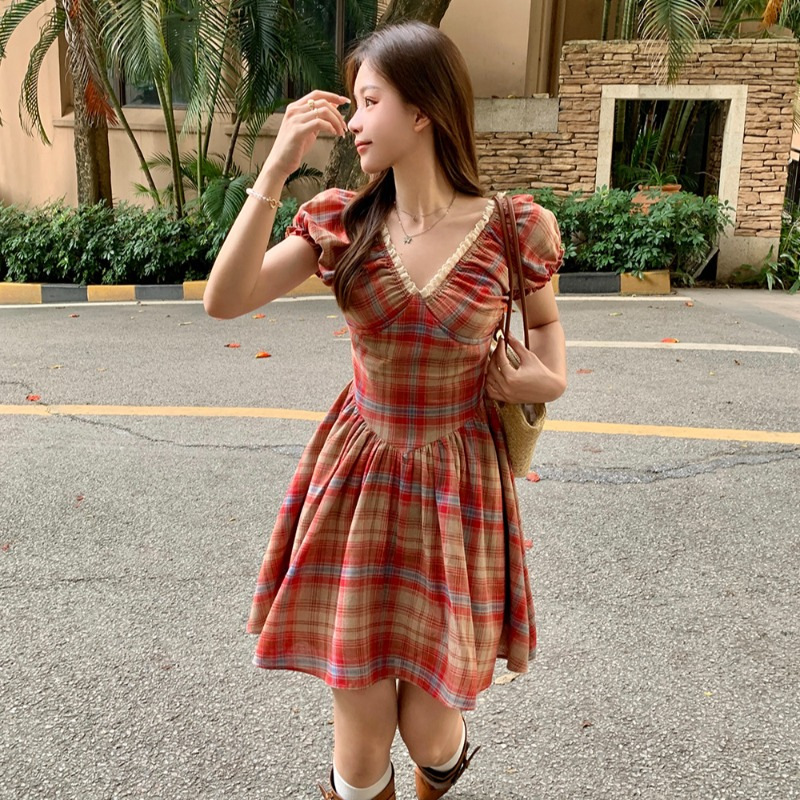 法式小众小个子连衣裙女夏季新款显瘦复古格子高级感泡泡袖短裙