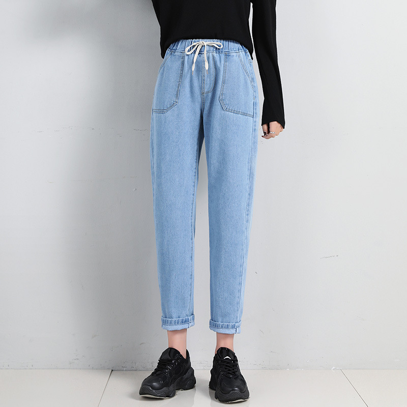 松紧腰牛仔裤女阔腿显瘦宽松直筒老爹裤小个子韩版高腰哈伦裤女潮