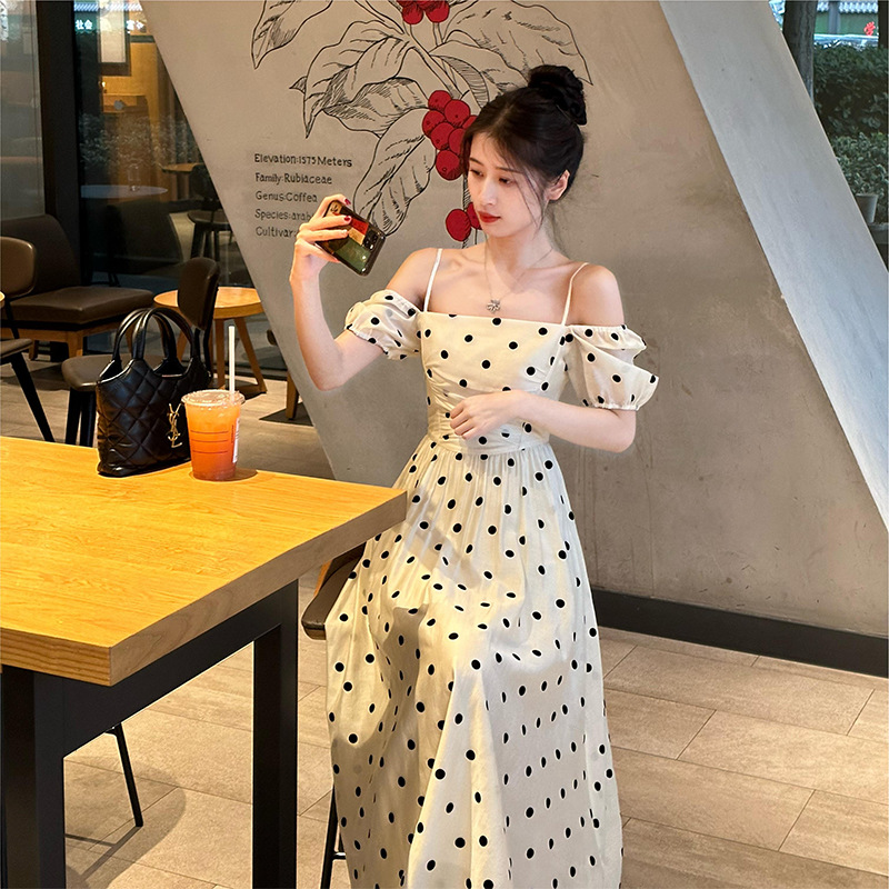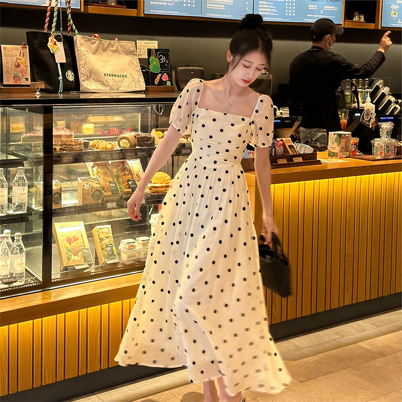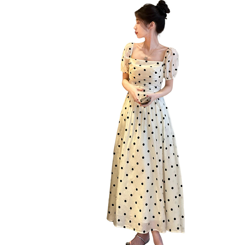 法式赫本风方领白色连衣裙子女装夏季收腰显瘦高级感波点长裙