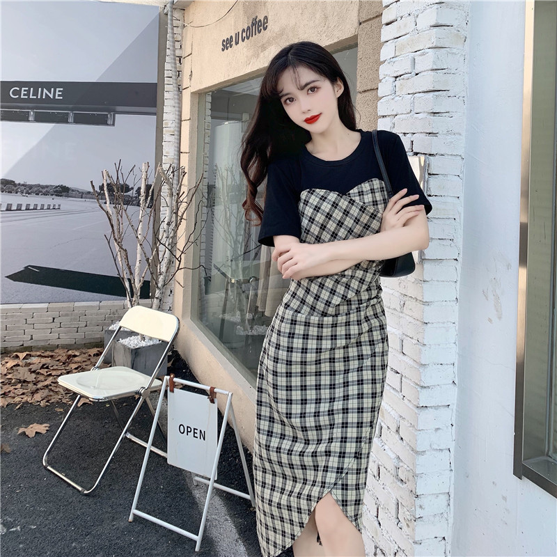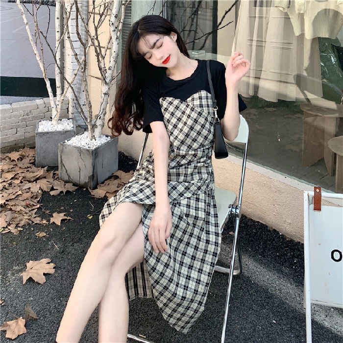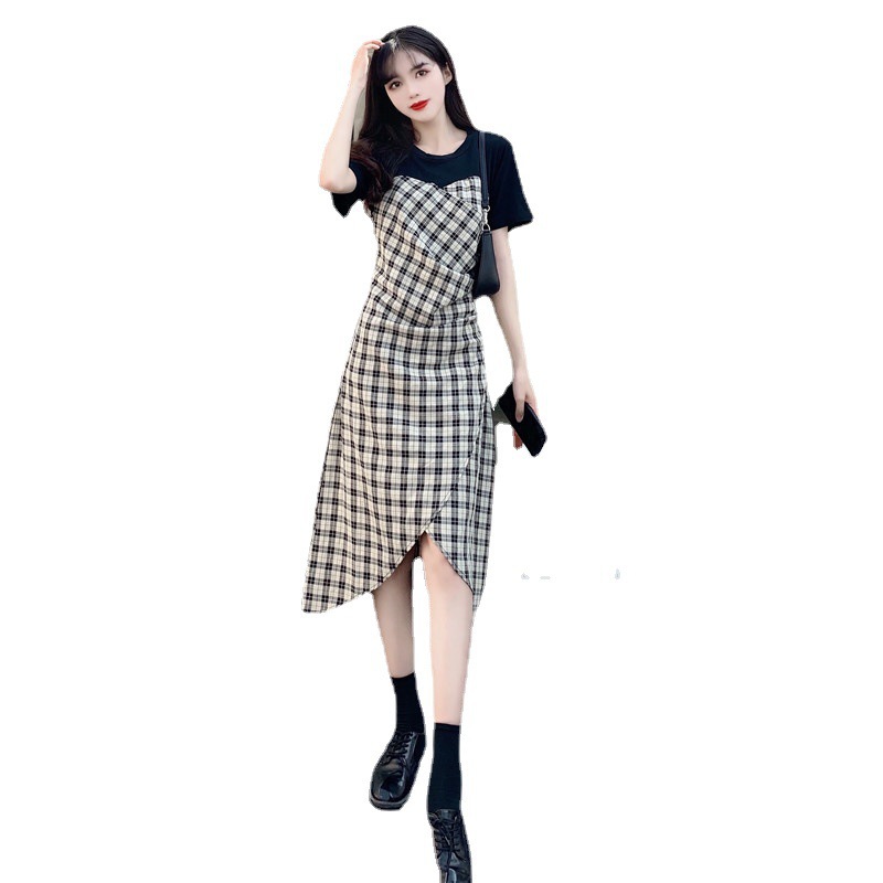 大码法式格子假两件连衣裙女夏微胖mm不规则设计高级感a字裙子