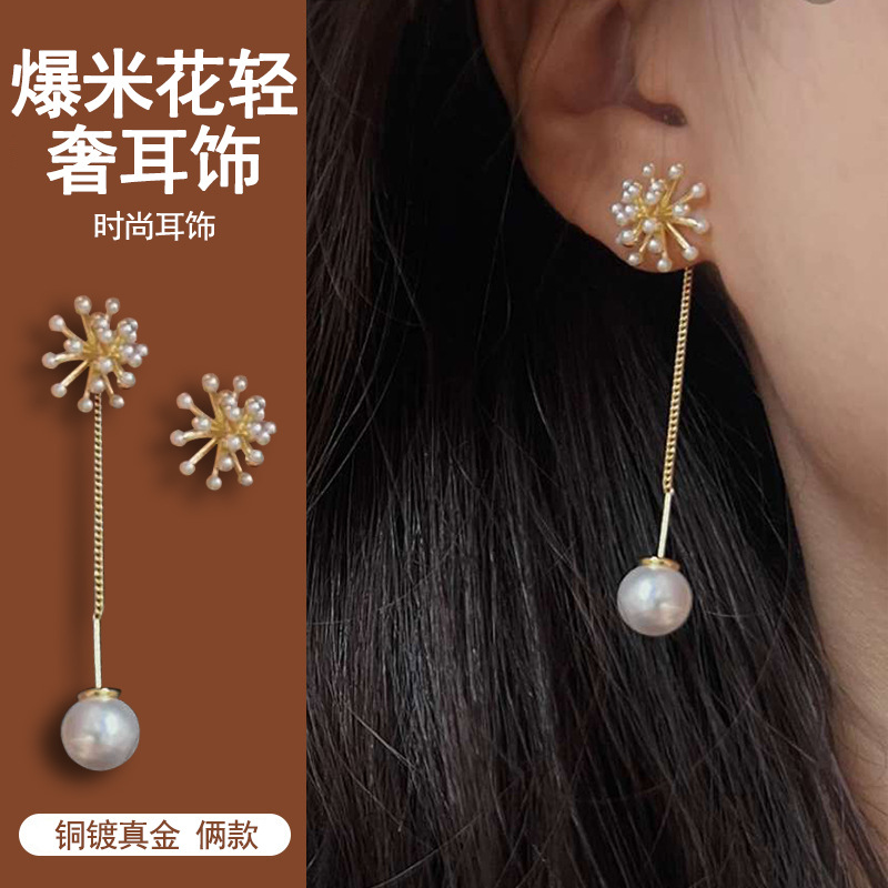 铜合金通勤耳饰女 新长款珍珠爆米花烟耳坠高级感轻奢耳环S925