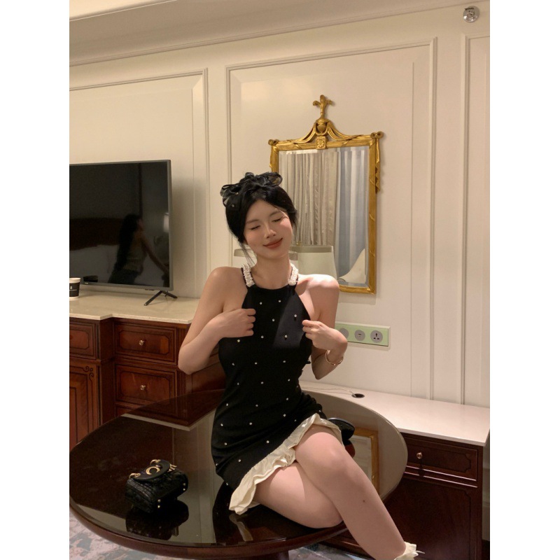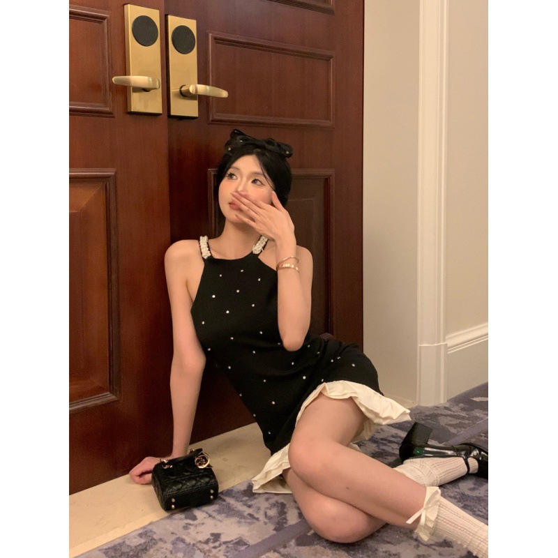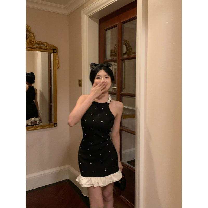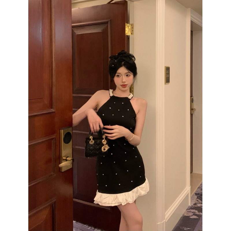 高级感法式挂脖无袖修身满天星A字裙木耳边重工镶钻背心连衣裙夏