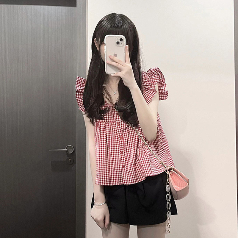 红色格子方领衬衫女设计感小众衬衣夏季新款宽松短款飞飞袖上衣潮