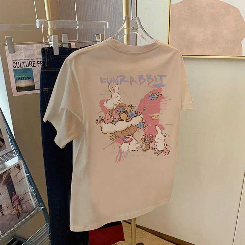 2025夏季新款兔子印花杏色纯棉短袖t恤女宽松时尚质感体恤上衣潮