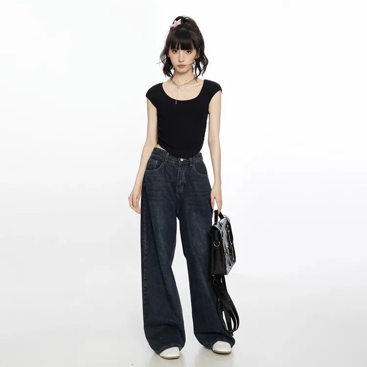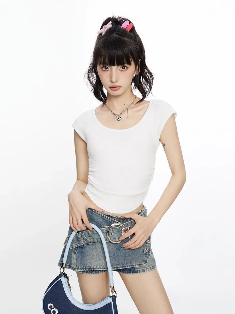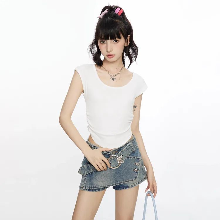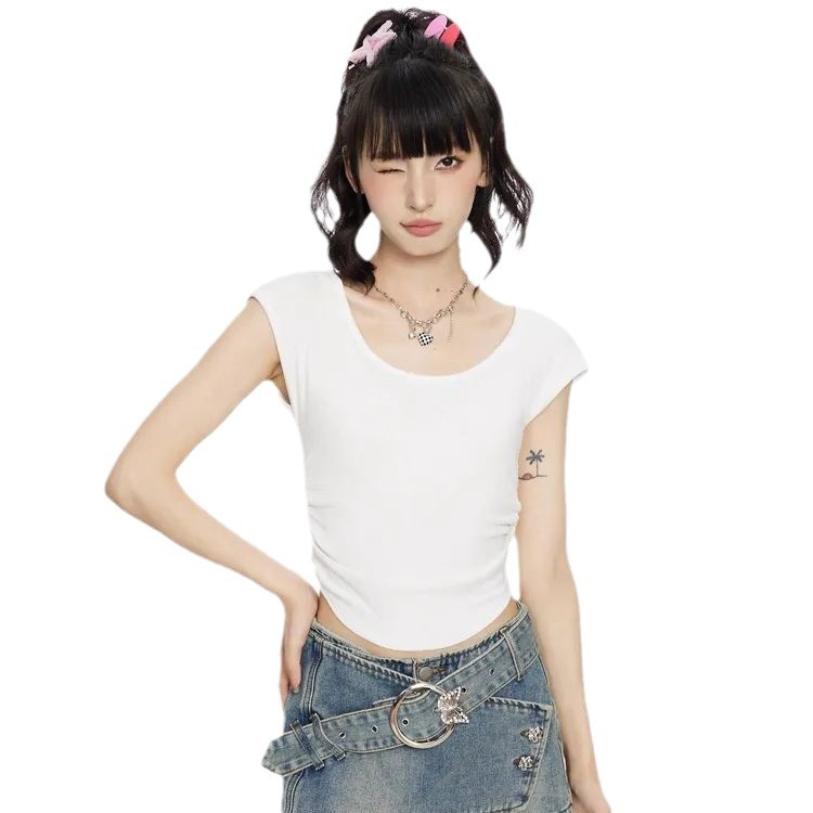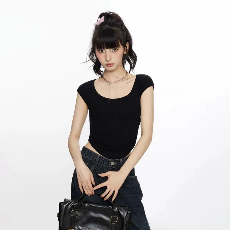 纯欲风U领正肩短袖t恤女夏季新款修身显瘦设计感辣妹短款褶皱上衣