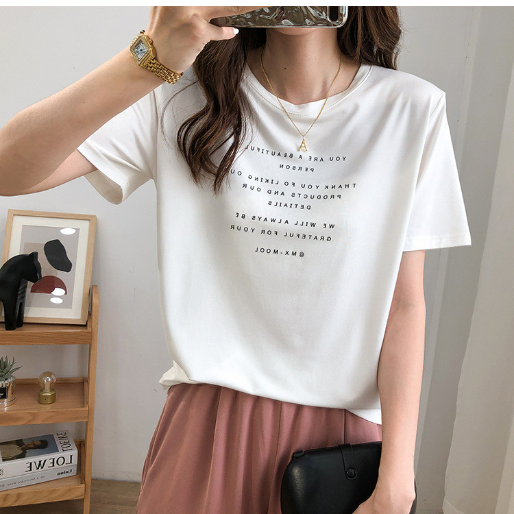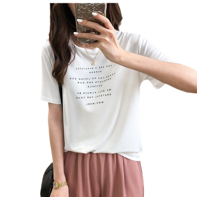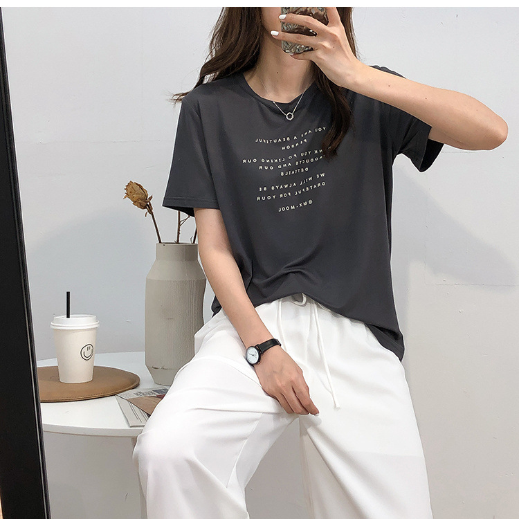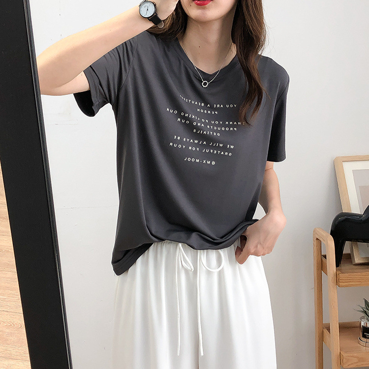 面料太舒服了!垂感洋气灰色莫代尔字母短袖T恤女夏季宽松打底衫