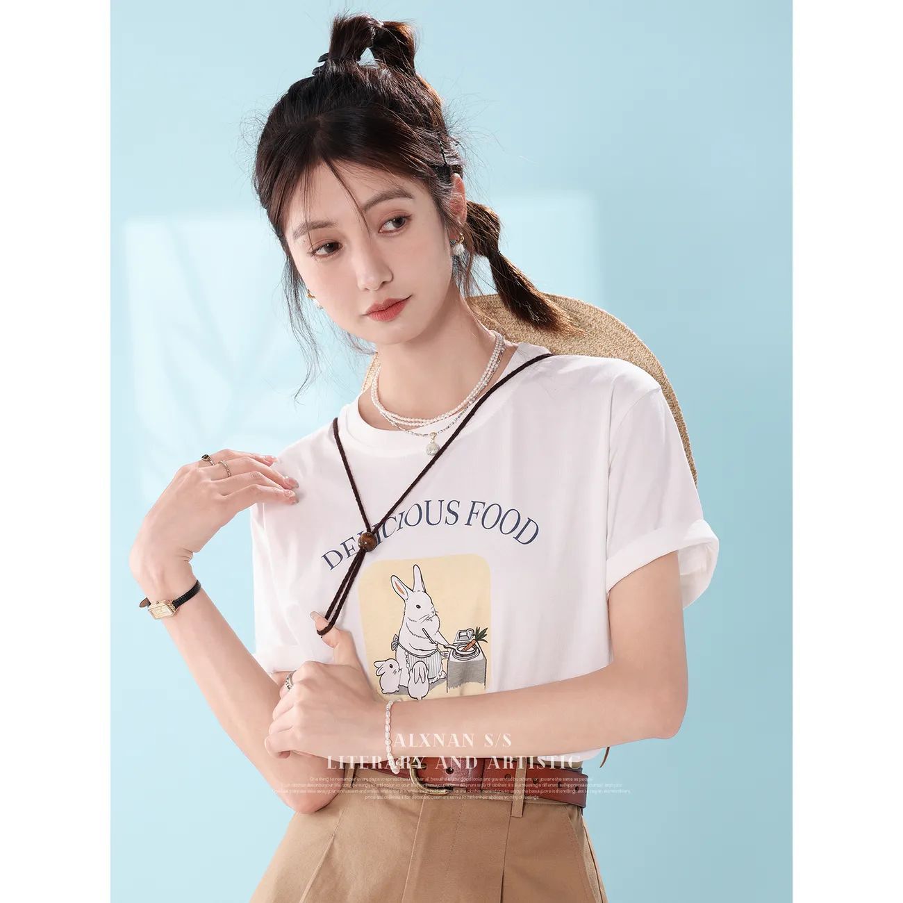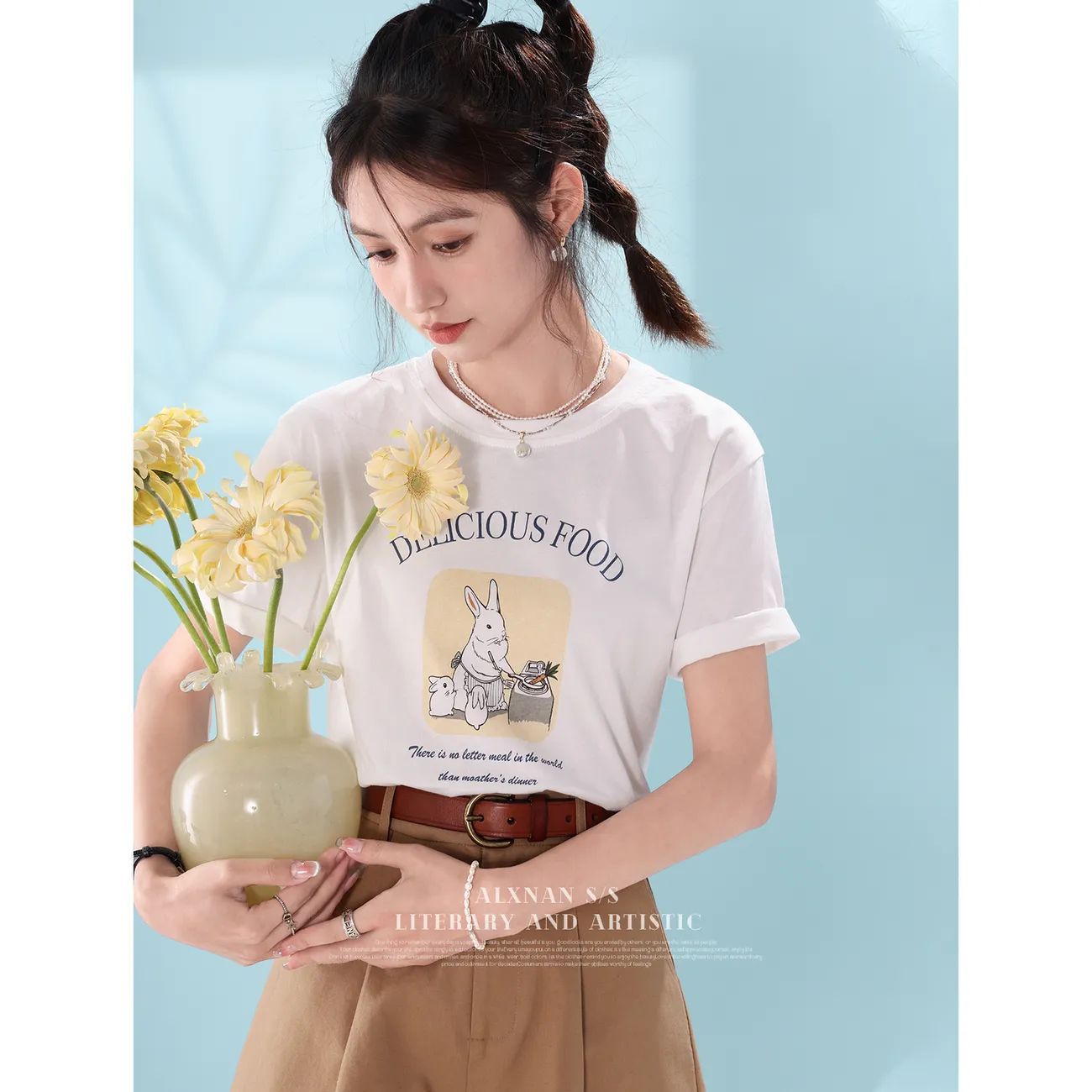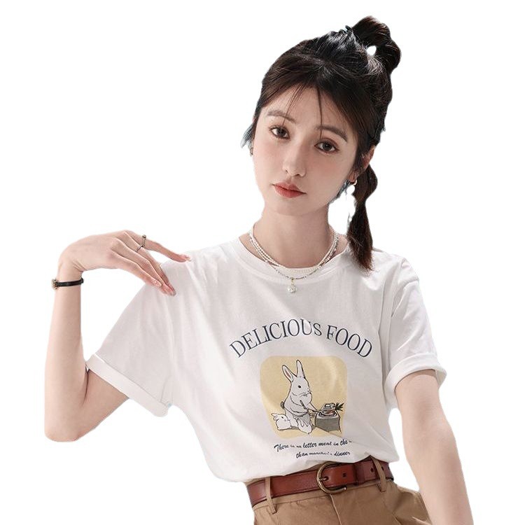 超手感莫代尔韩版小兔甜美宽松百搭圆领印花遮肉短袖t恤女ins打底