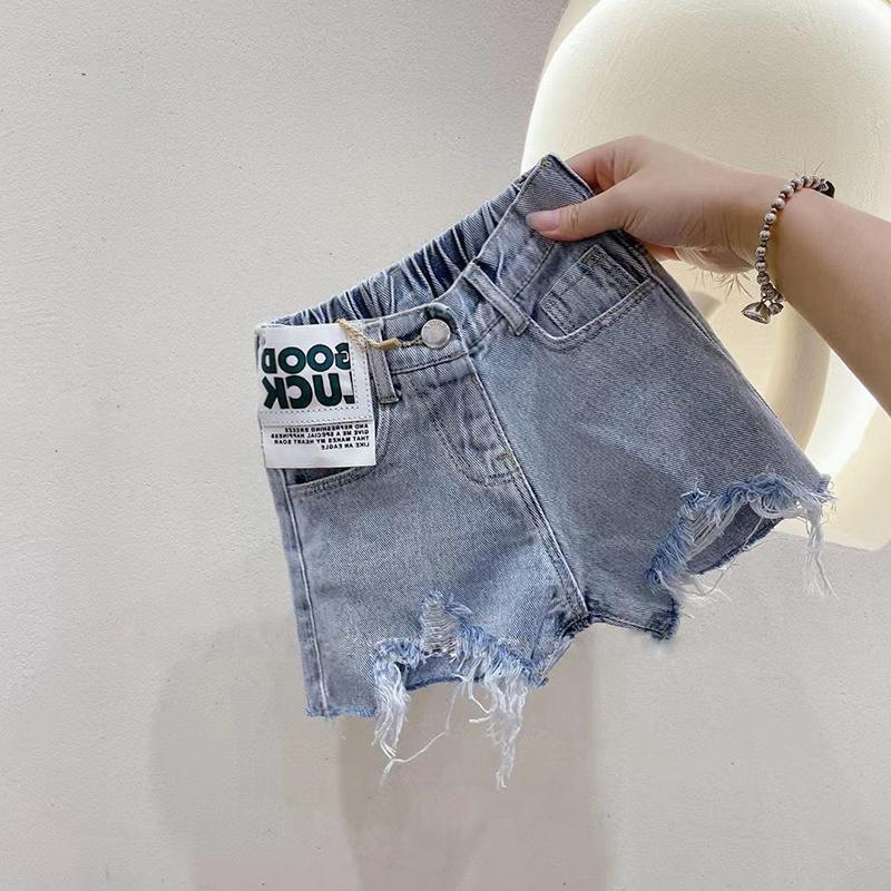 夏季女童牛仔短裤宝宝洋气儿童个性潮牌韩版字母贴布破洞毛边热裤