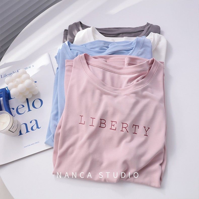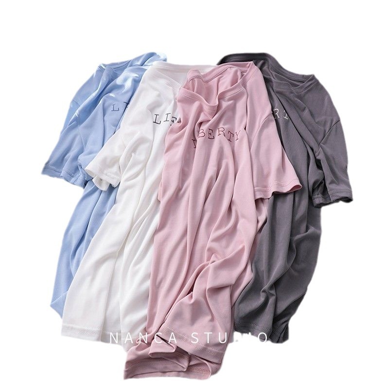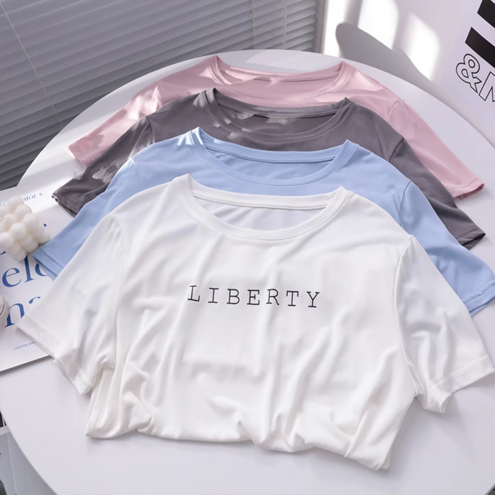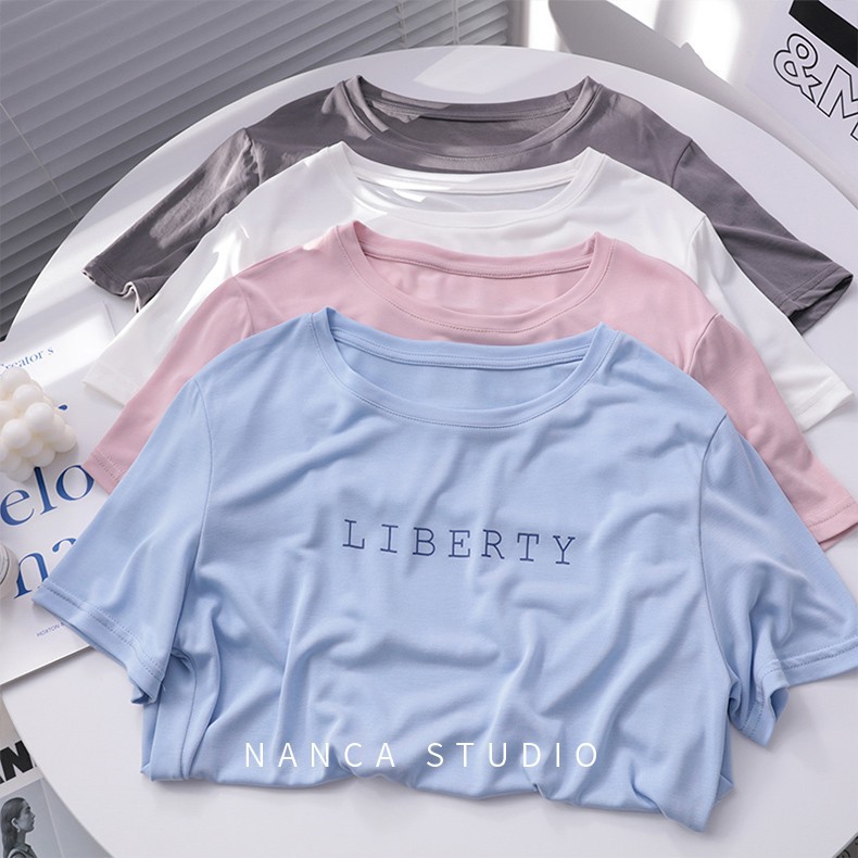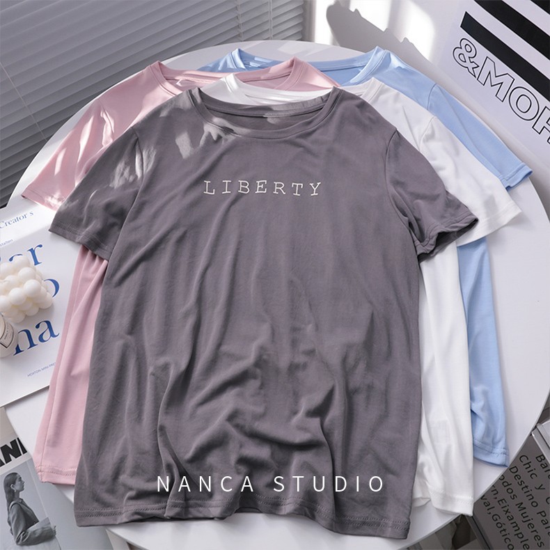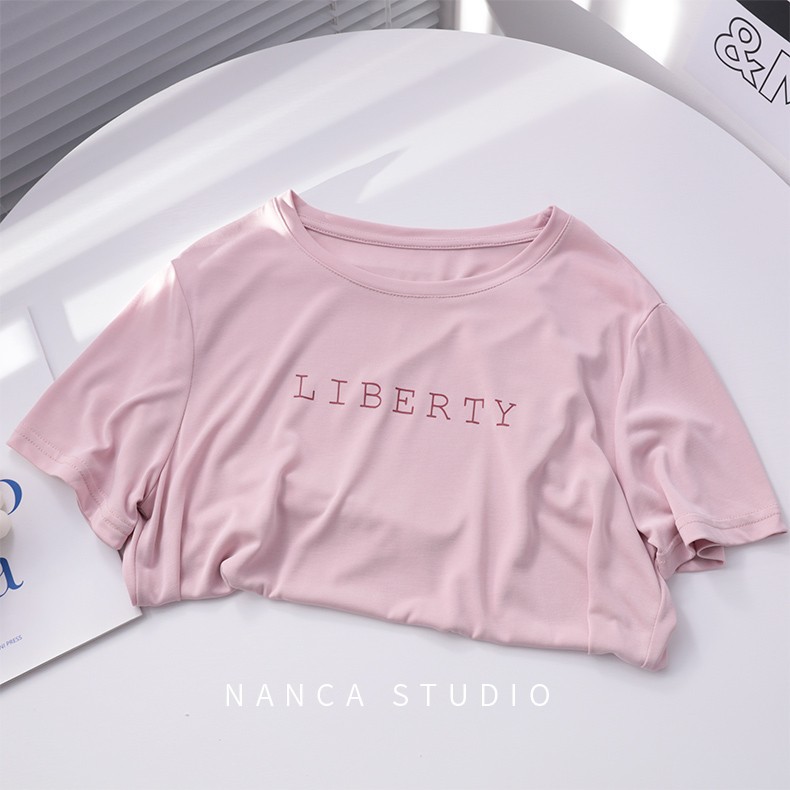 轻薄凉快~莫代尔短袖T恤女夏季新款休闲字母印花圆领打底上衣体恤