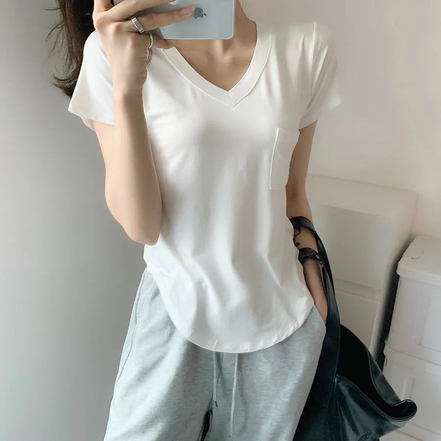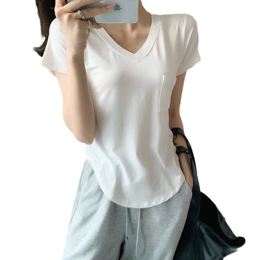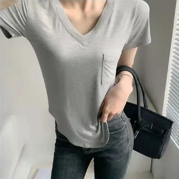 夏季纯色V领莫代尔棉短袖口袋纯欲风垂坠感锁骨宽松t恤女