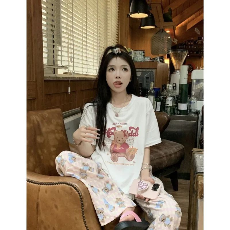 超手感莫代尔小熊字母印花短袖t恤女夏季小众减龄宽松百搭打底衫
