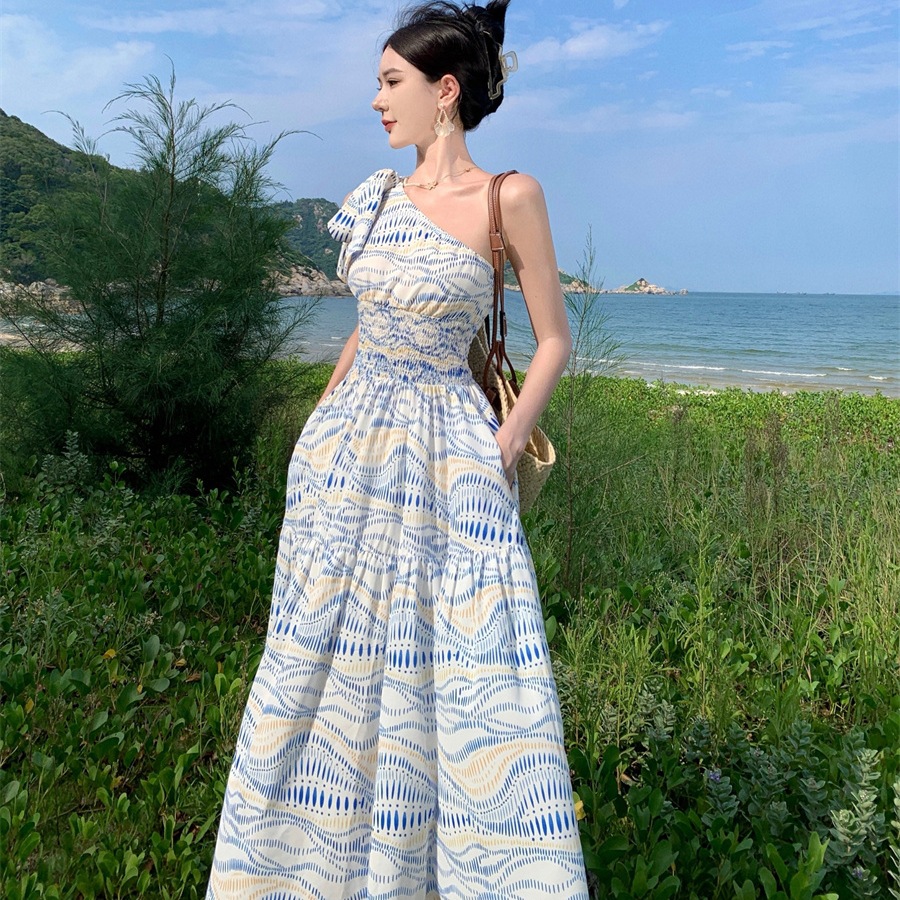 夏季新款挂脖露肩法式长裙海边度假油画连衣裙女今年流行漂亮裙子