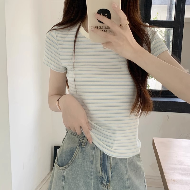 蓝白条纹正肩短袖t恤女夏季别致修身纯棉基础款内搭体恤打底上衣
