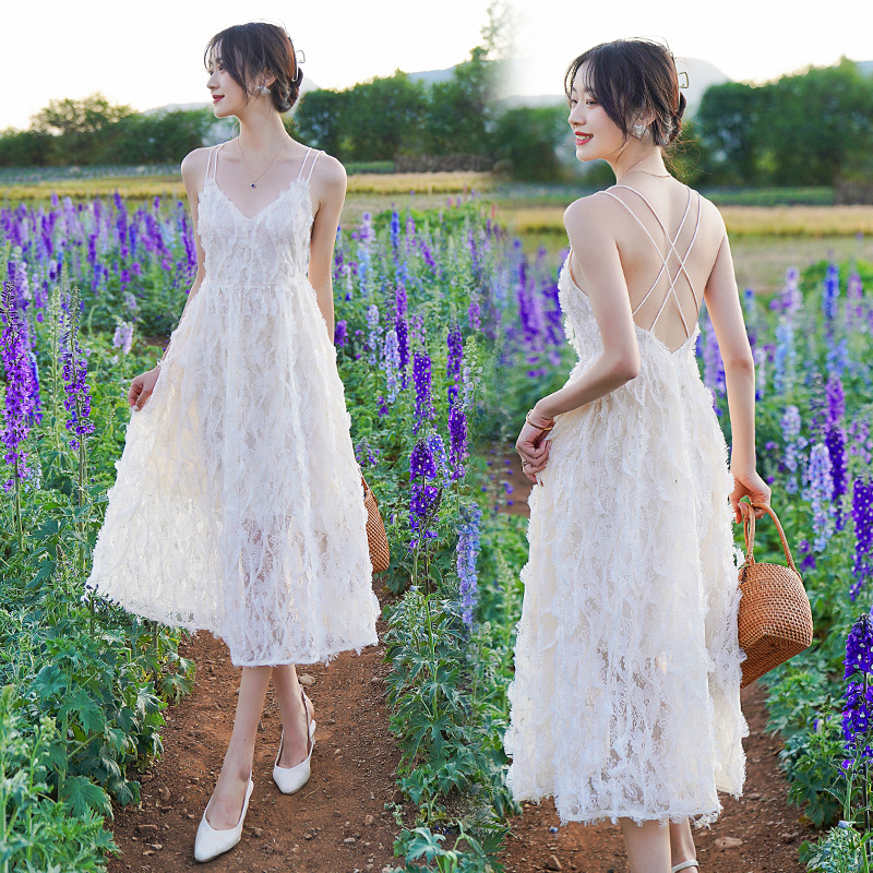 海边度假沙滩裙流苏羽毛吊带露背显瘦中长款连衣裙女