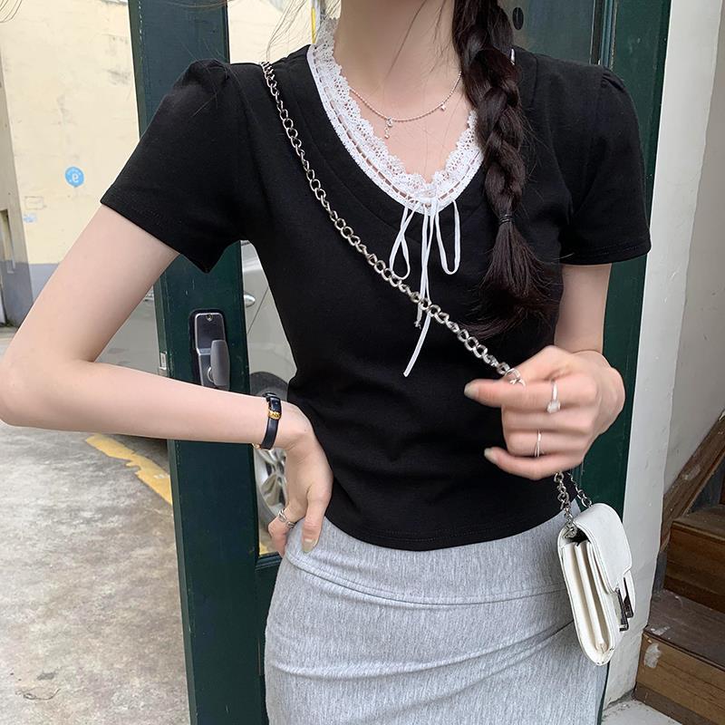 小个子V领蕾丝边系带黑色正肩短袖t恤女夏季韩系设计感