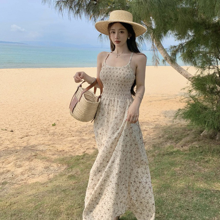 夏季女装新款法式复古碎花吊带连衣裙气质显瘦露背海边度假长裙子