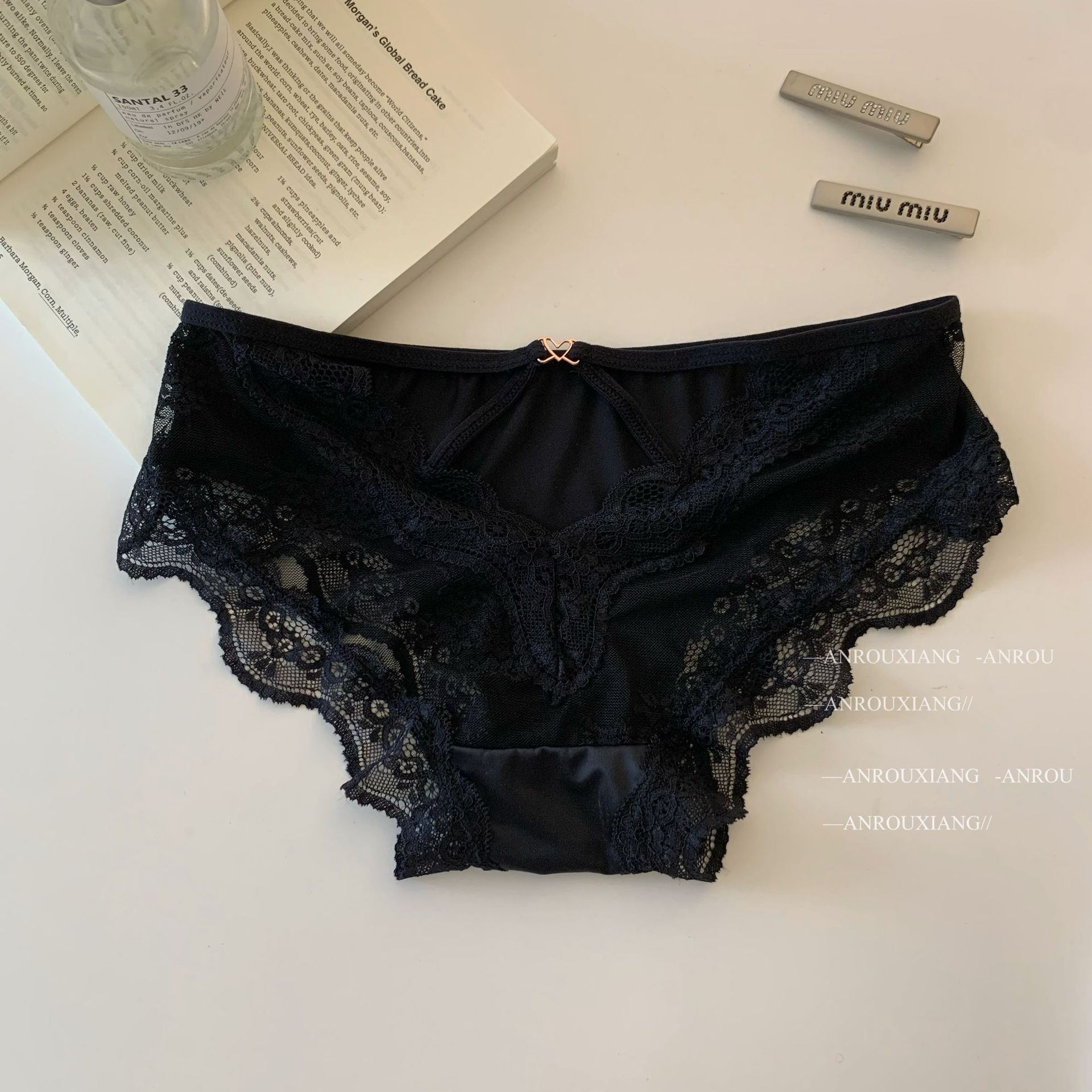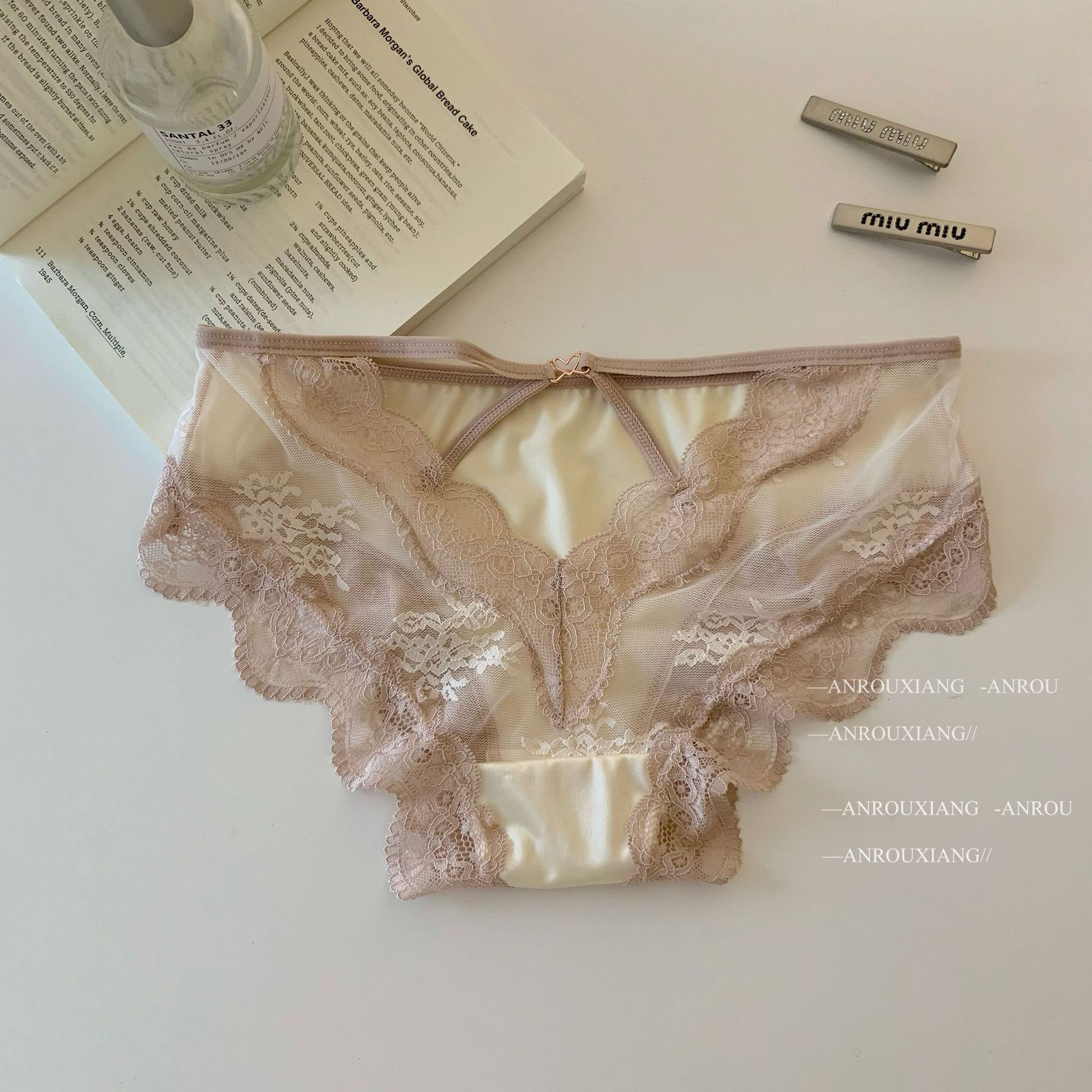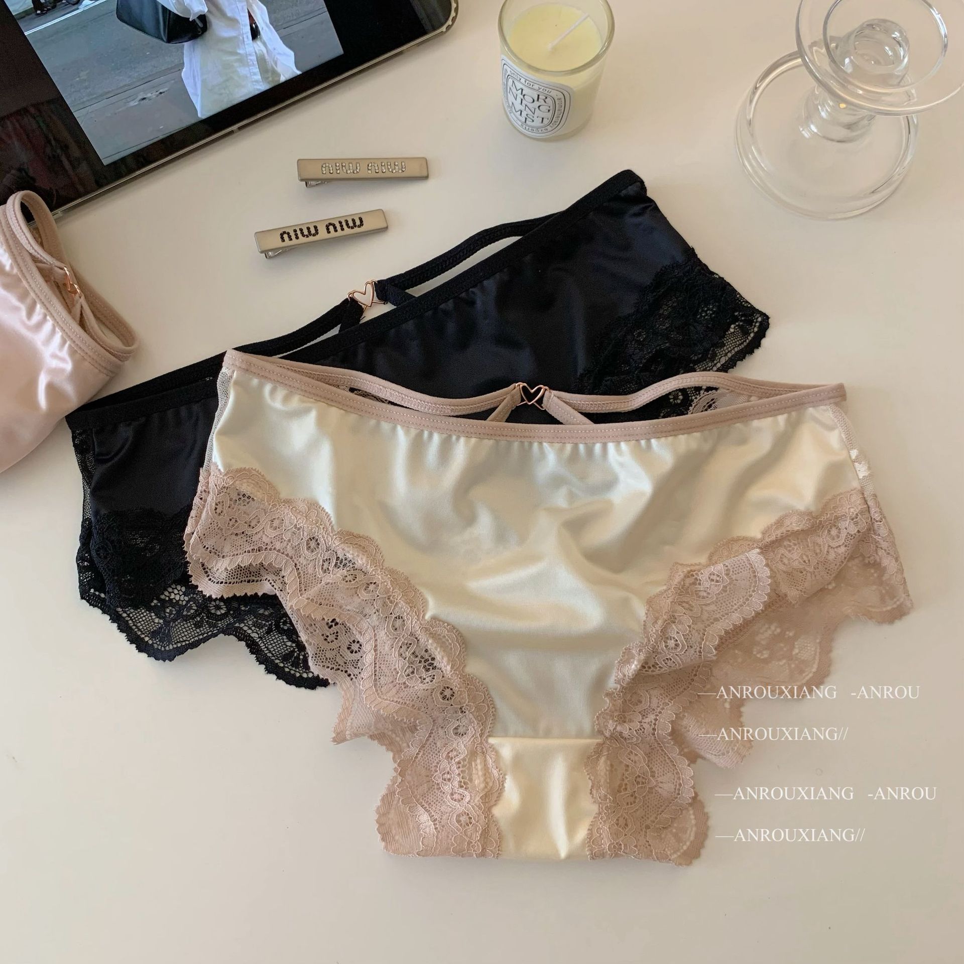 甜欲小蜜桃~法式性感缎面蕾丝内裤女纯欲镂空透气纯棉裆三角内裤
