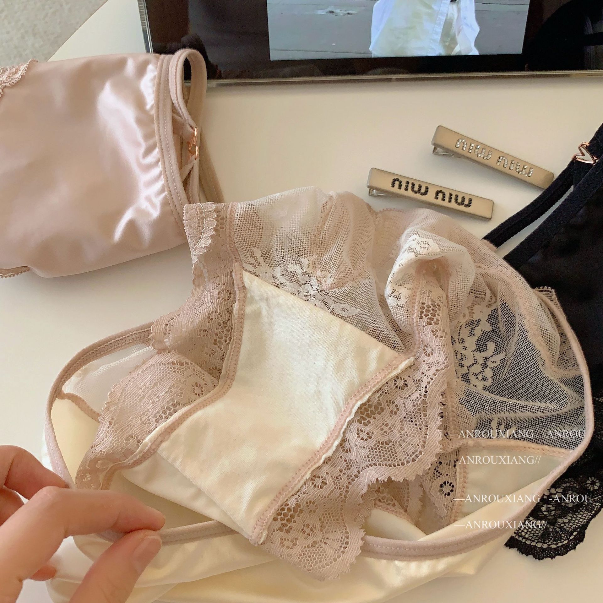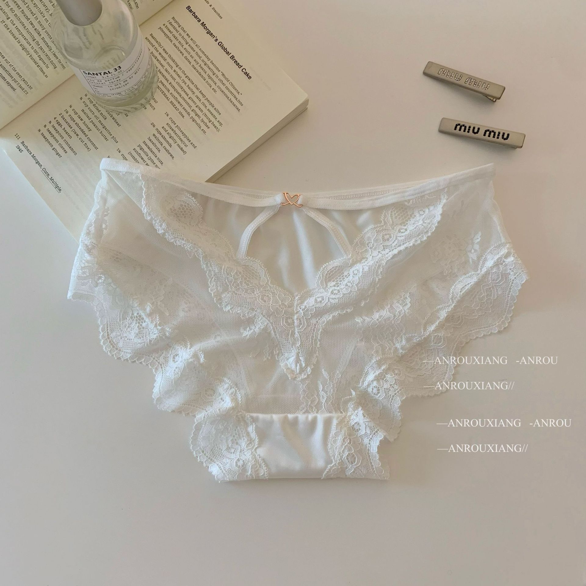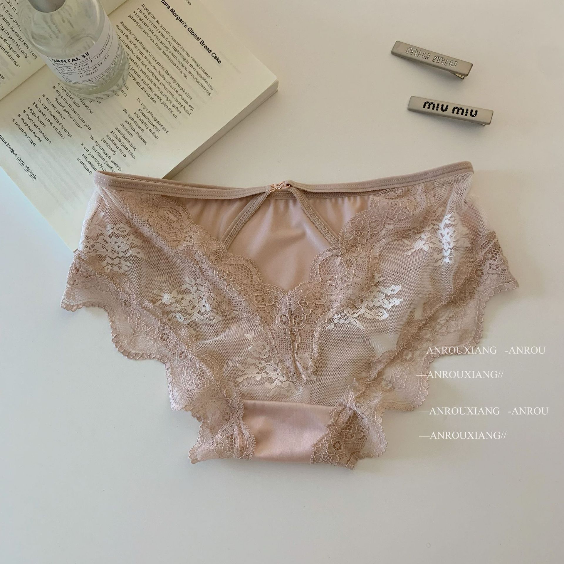 甜欲小蜜桃~法式性感缎面蕾丝内裤女纯欲镂空透气纯棉裆三角内裤