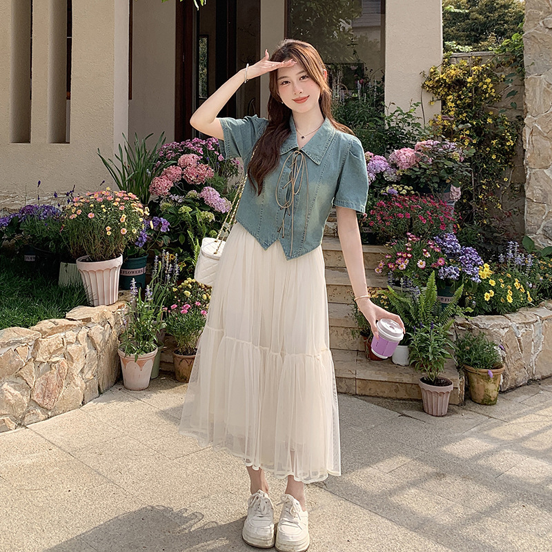夏季新款时尚裙子套装炸街洋气绑带牛仔短袖上衣半身裙两件套