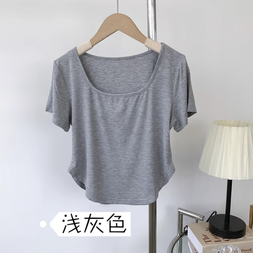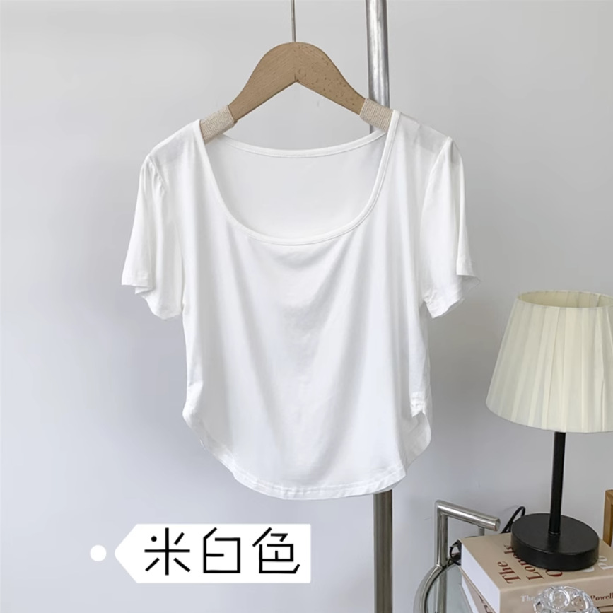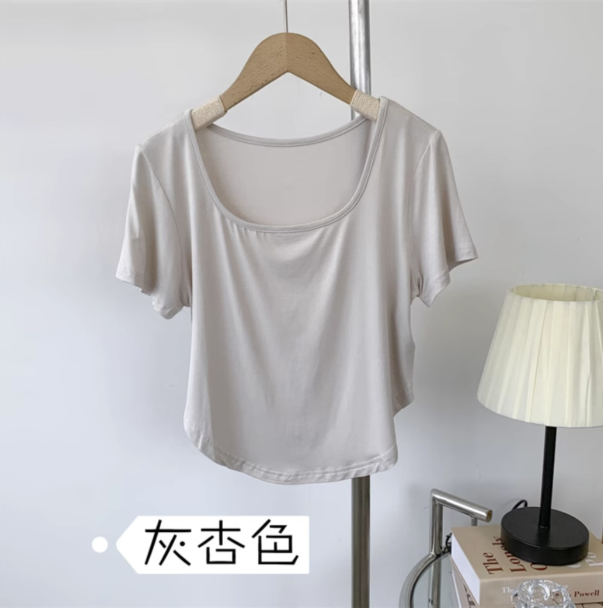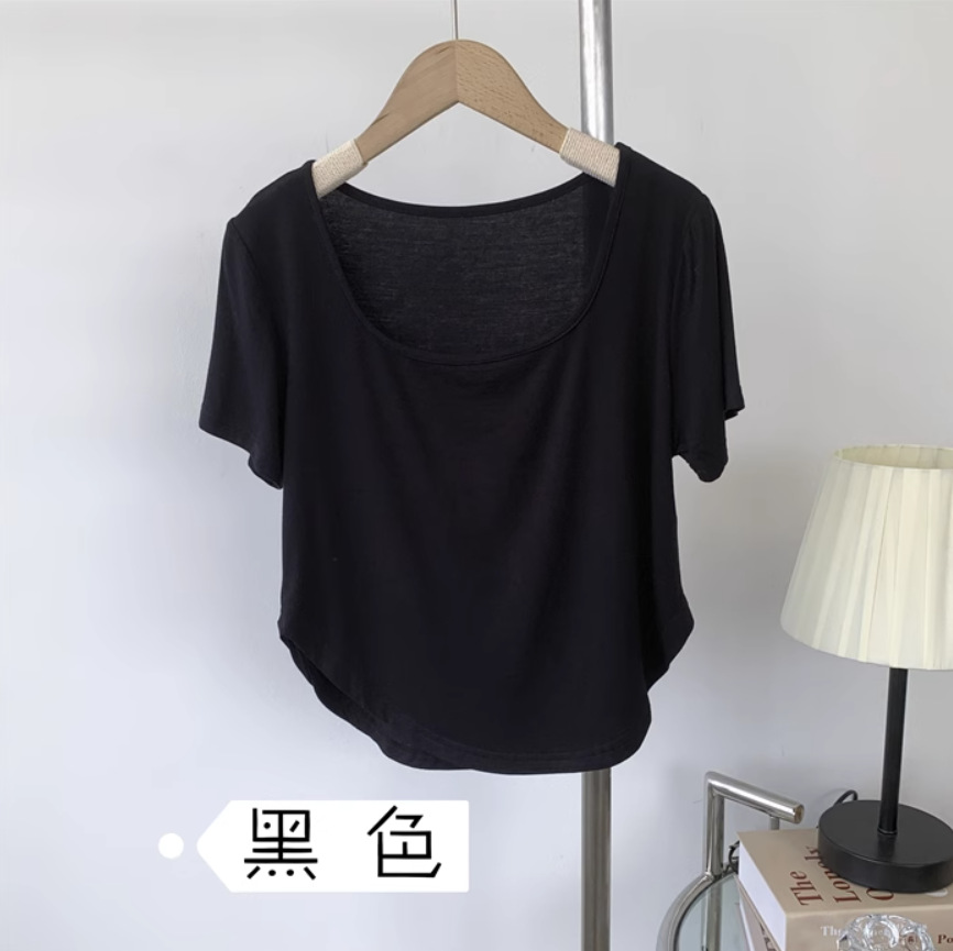 方领短款莫代尔T恤女简约夏季新款修身显瘦短款打底衫薄款上衣服