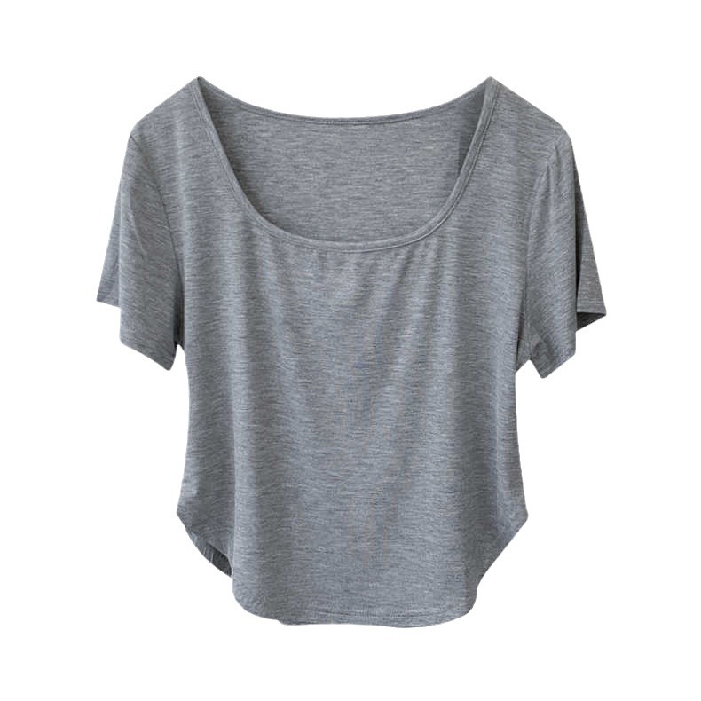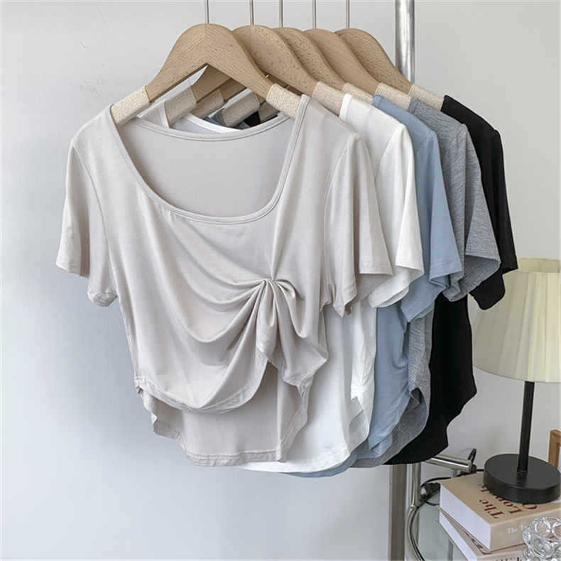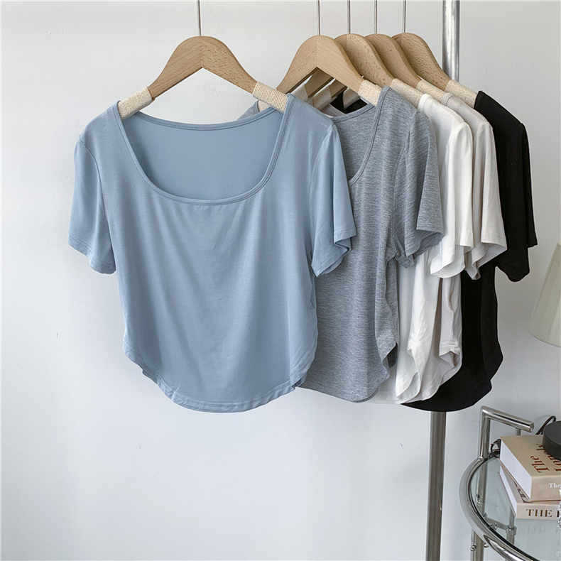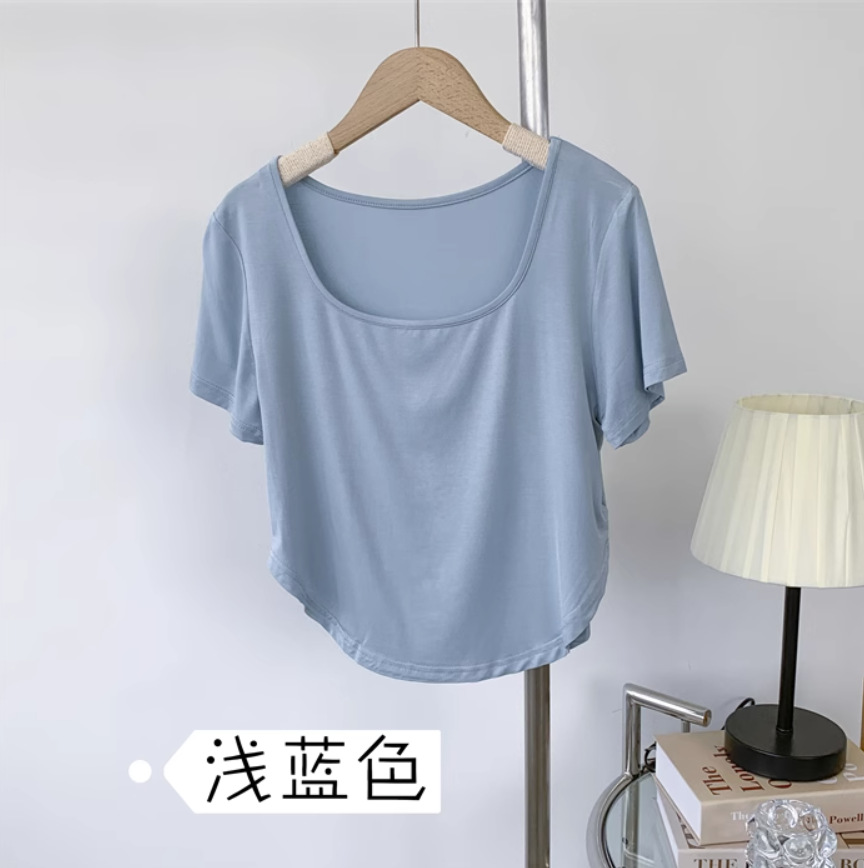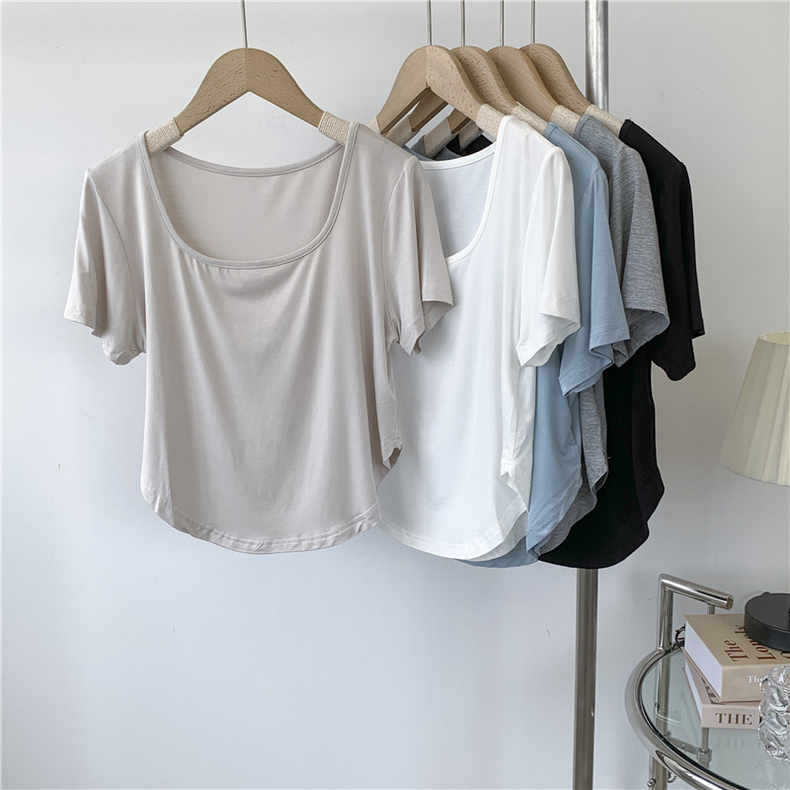 方领短款莫代尔T恤女简约夏季新款修身显瘦短款打底衫薄款上衣服