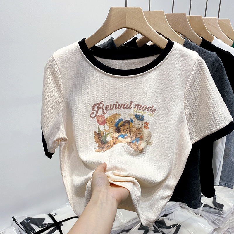 美式复古印花正肩短款t恤女装夏季新款修身短袖杏色体恤上衣