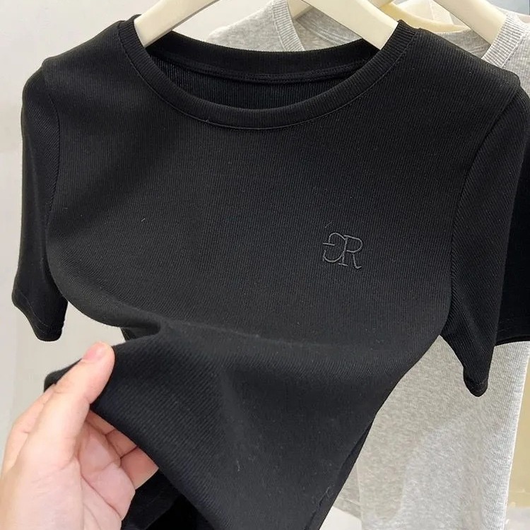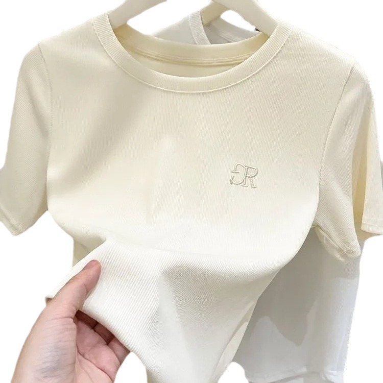 高档夏季新款短袖t恤女小众设计感冰丝螺纹纯欲风圆领刺绣体恤潮