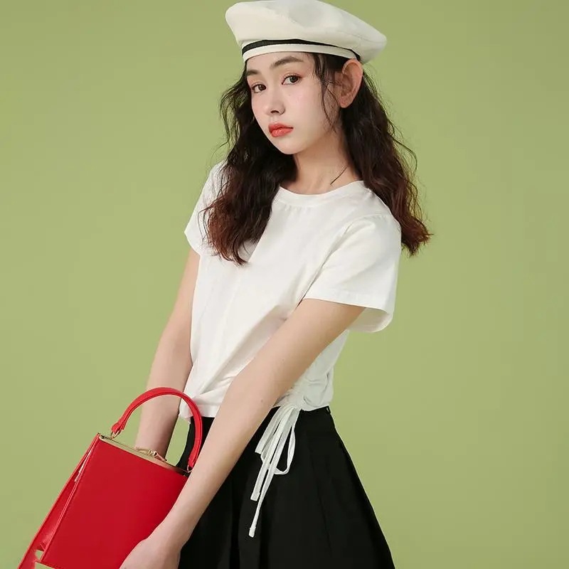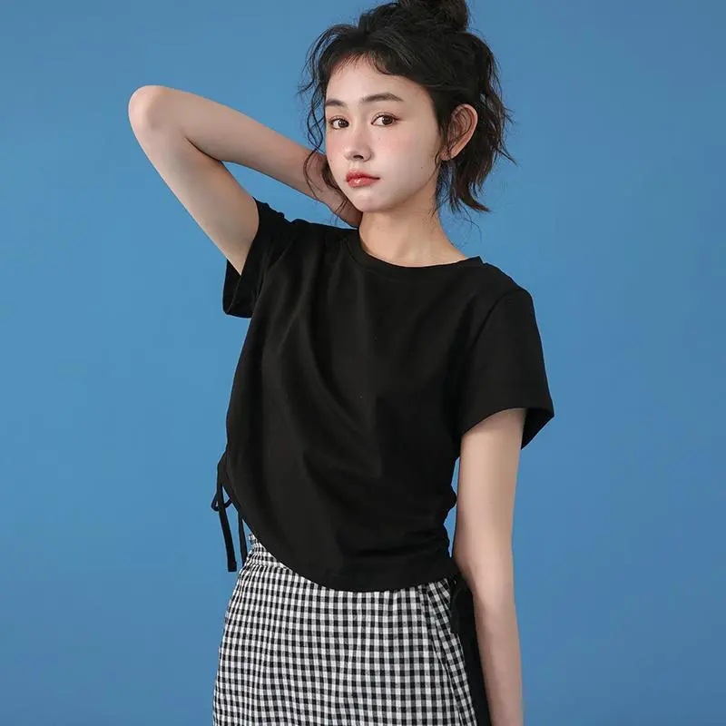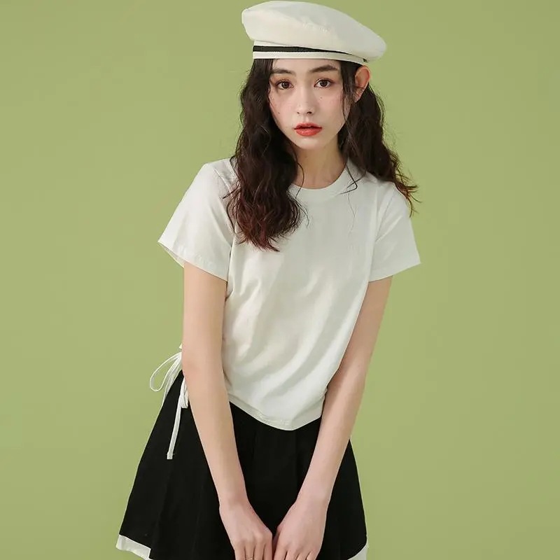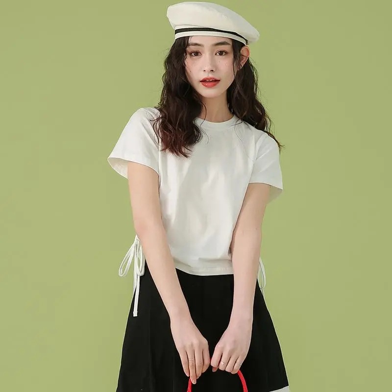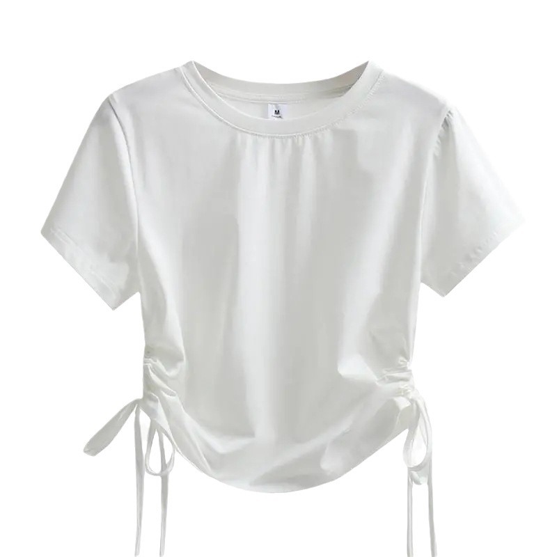 短袖t恤女新款甜辣妹短款设计感小众洋气圆领白色抽绳上衣ins