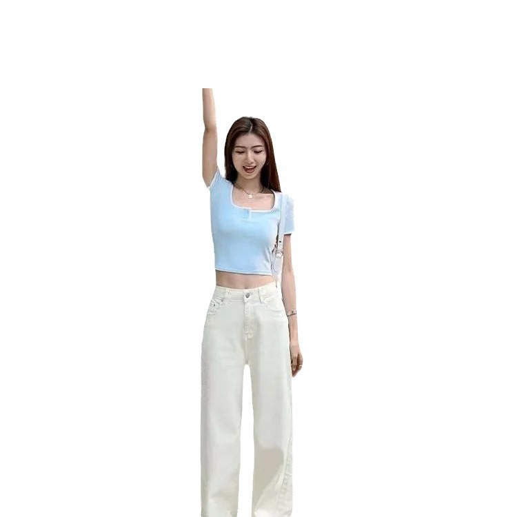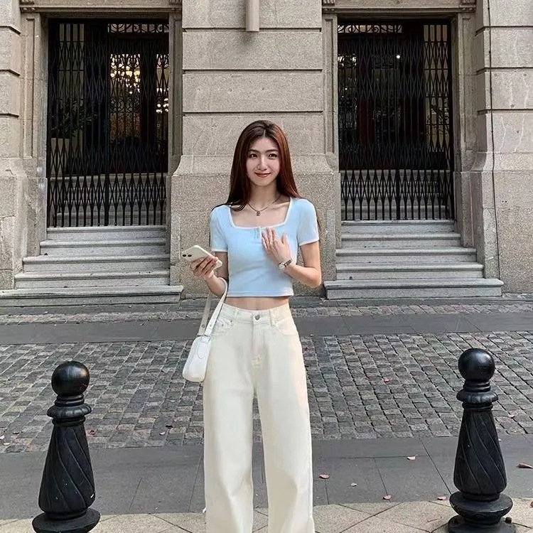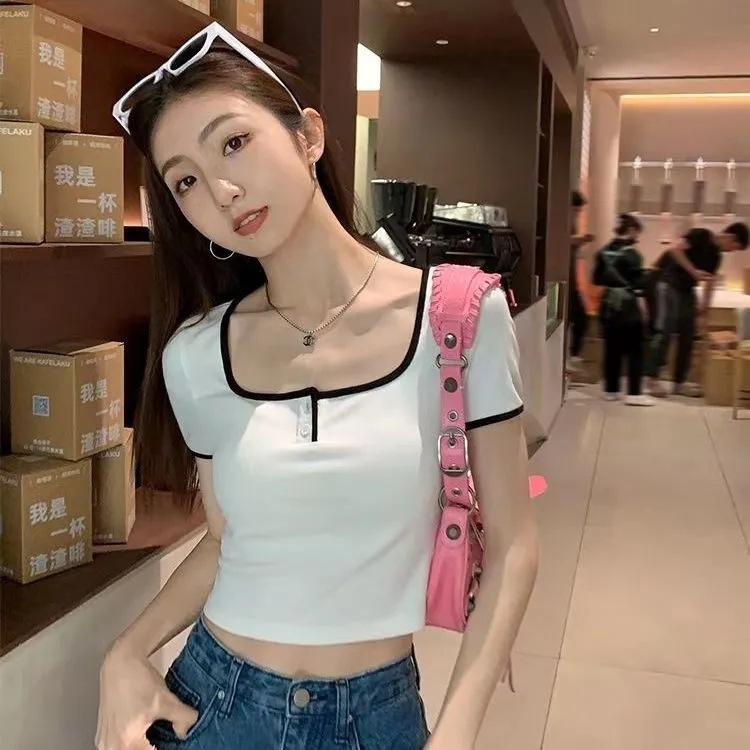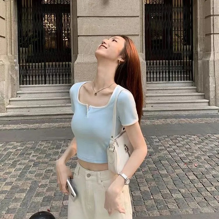 撞色方领短袖t恤女夏新款小众设计感修身显瘦短款甜辣上衣ins