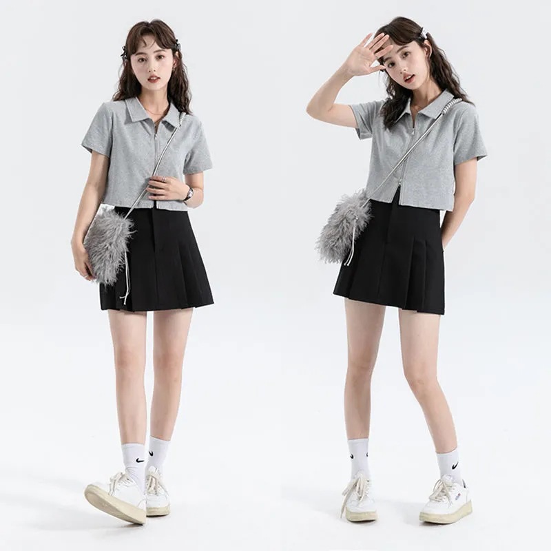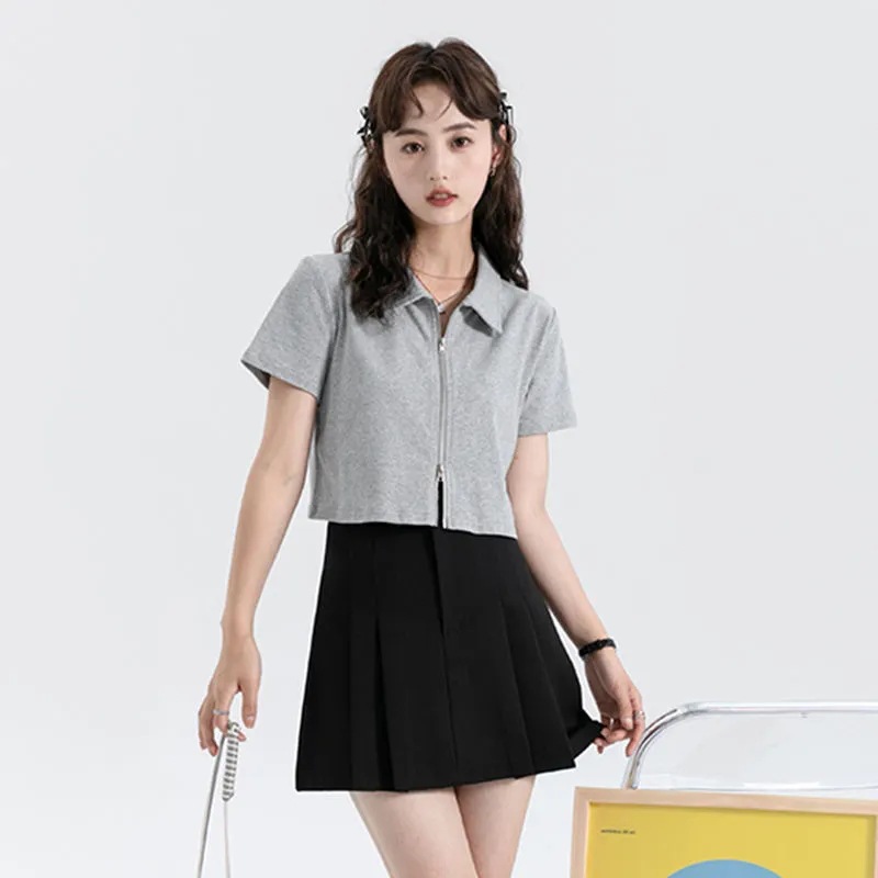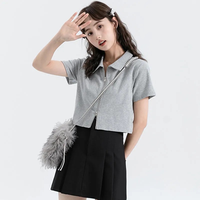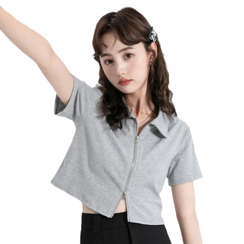 polo翻领双拉链短袖t恤女短款夏季新款韩版设计感小众ins上衣