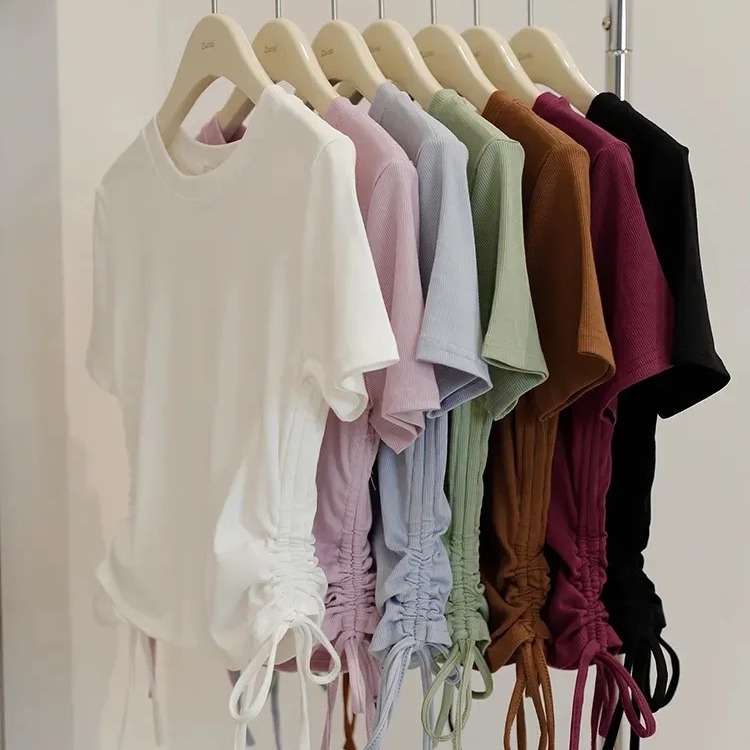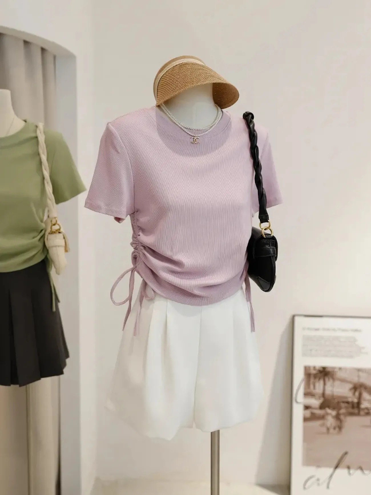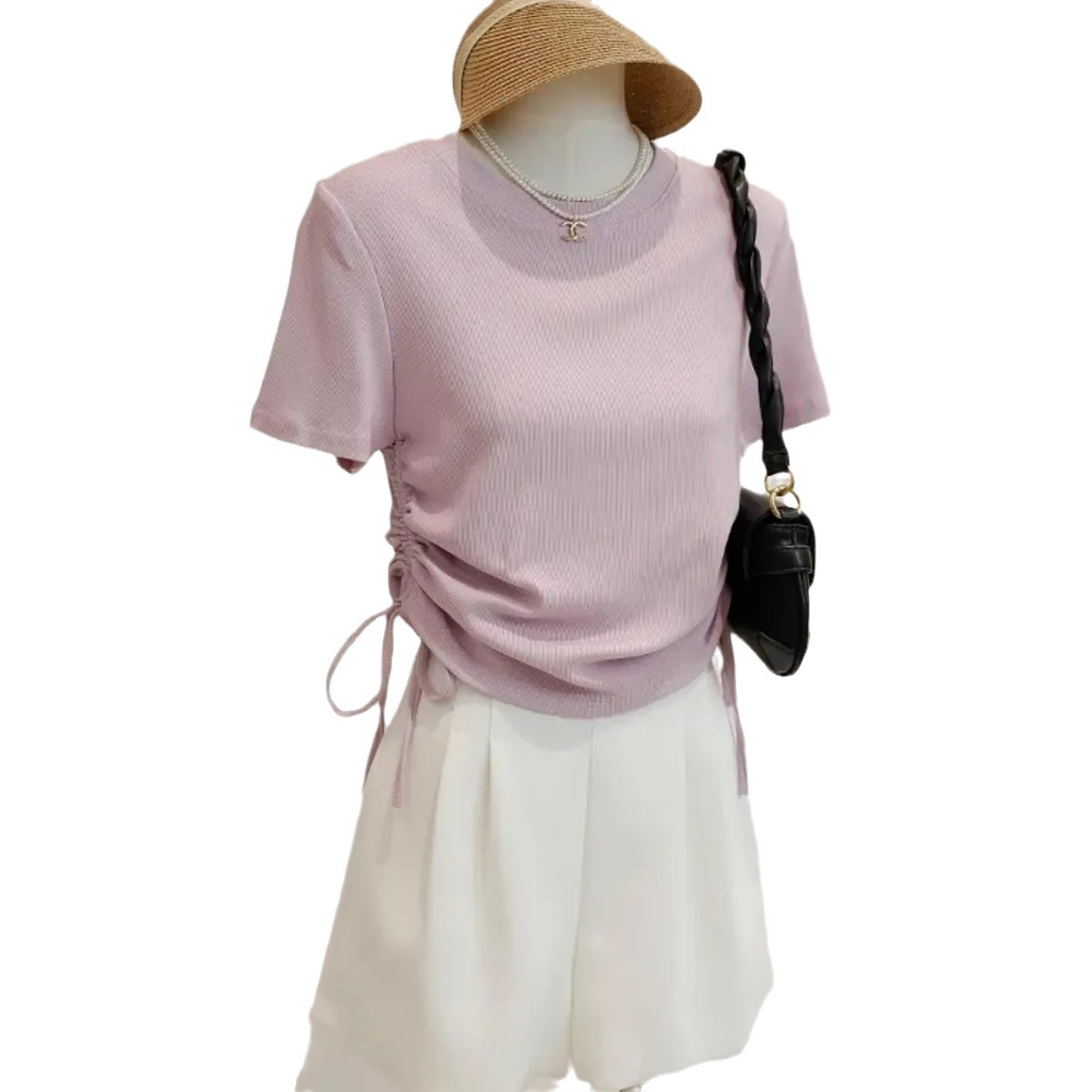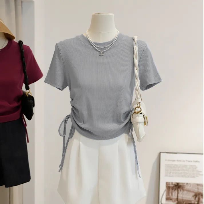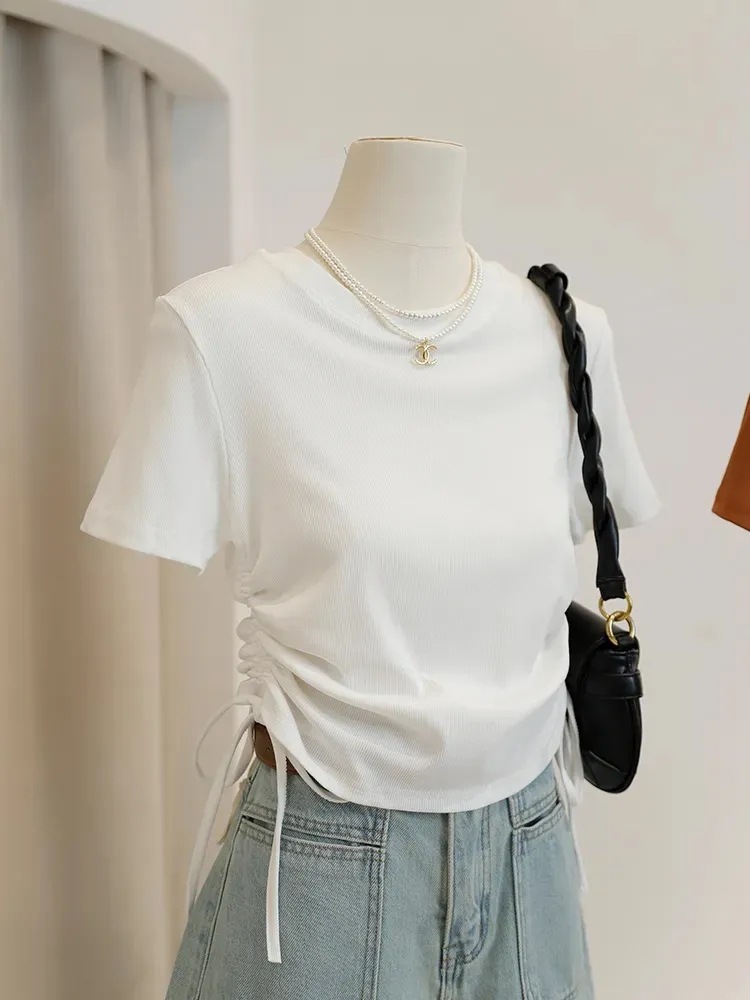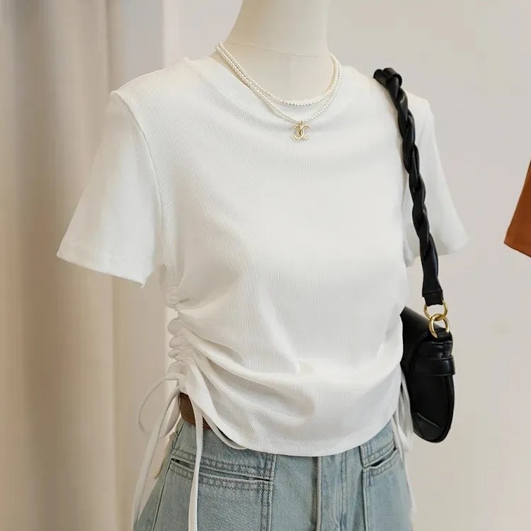 洋气复古修身打底短袖t恤女夏季辣妹设计感小众内搭抽绳圆领上衣