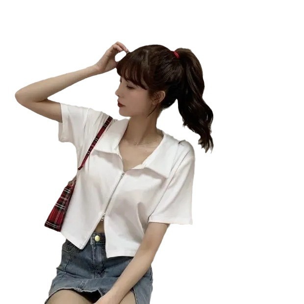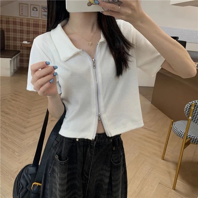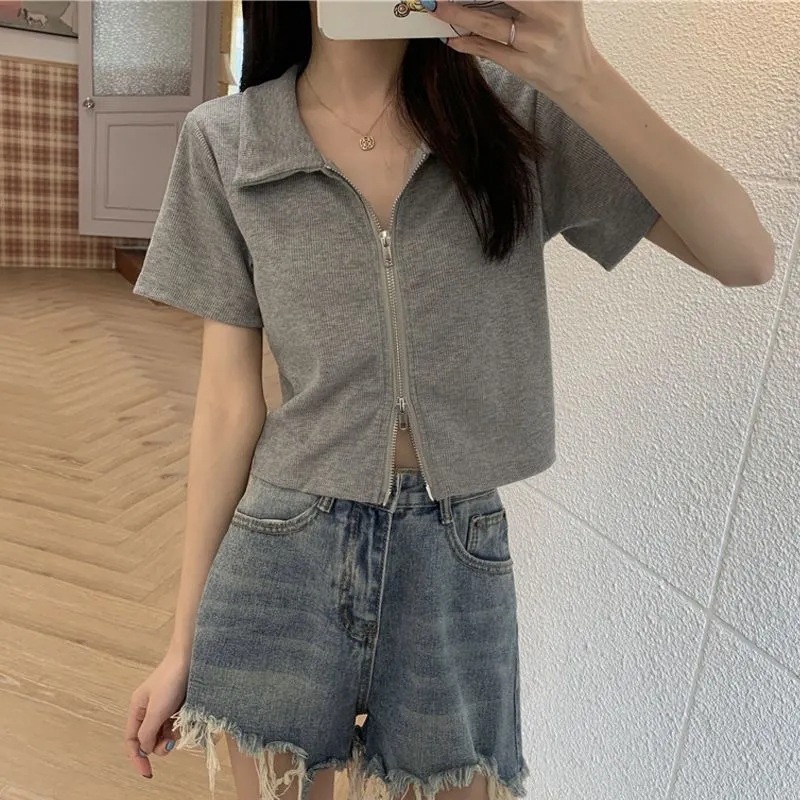 夏季新款POLO翻领灰色短袖t恤女设计感双拉链正肩短上衣ins潮