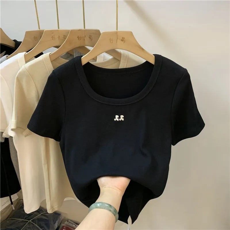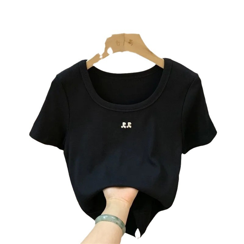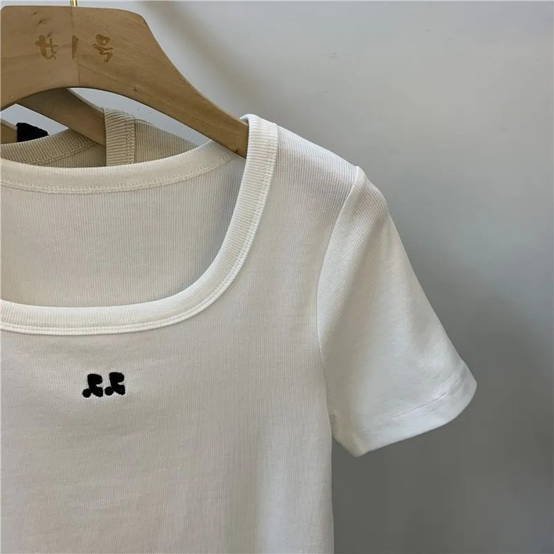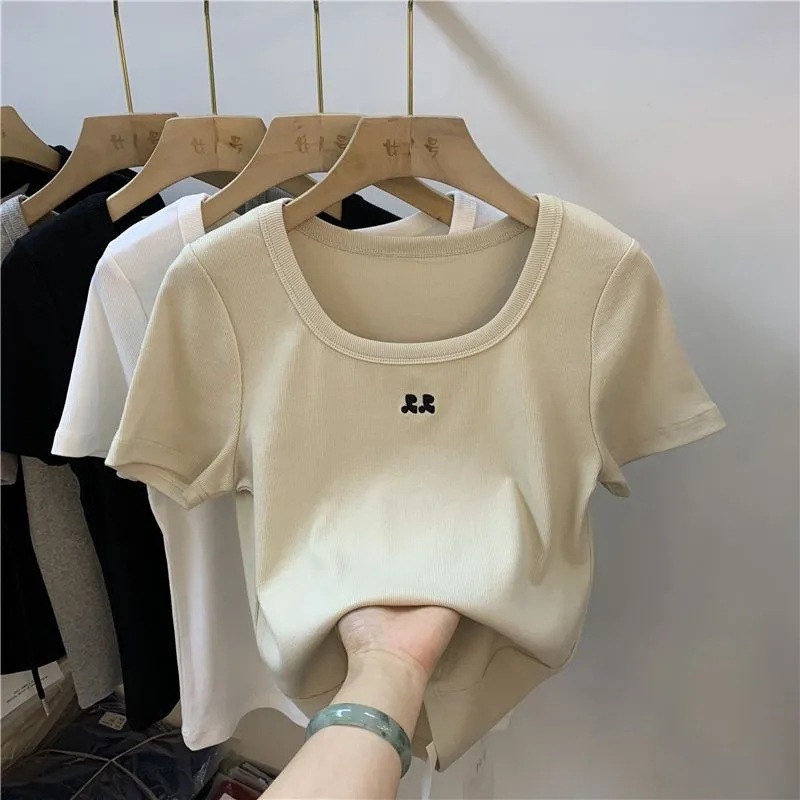 冰丝方领短款上衣女年夏季新款小众设计感刺绣修身短袖上衣女