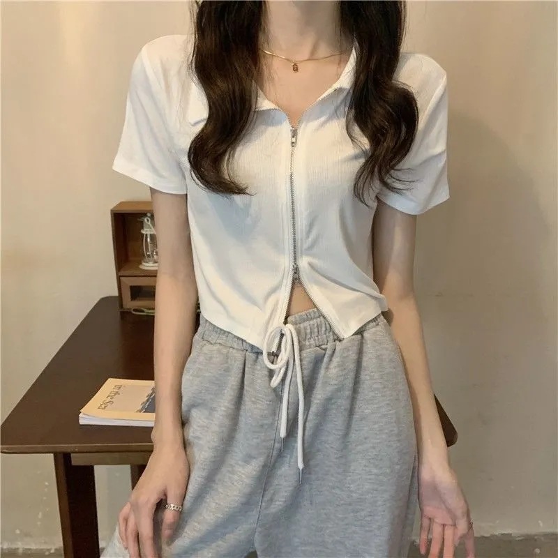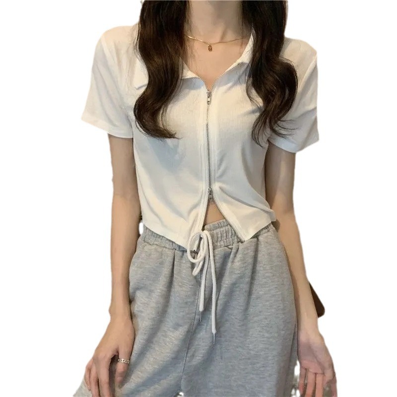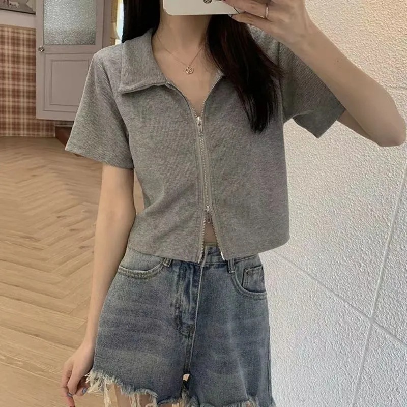 灰色双拉链polo衫短袖t恤女夏新款设计感修身短款百搭上衣潮