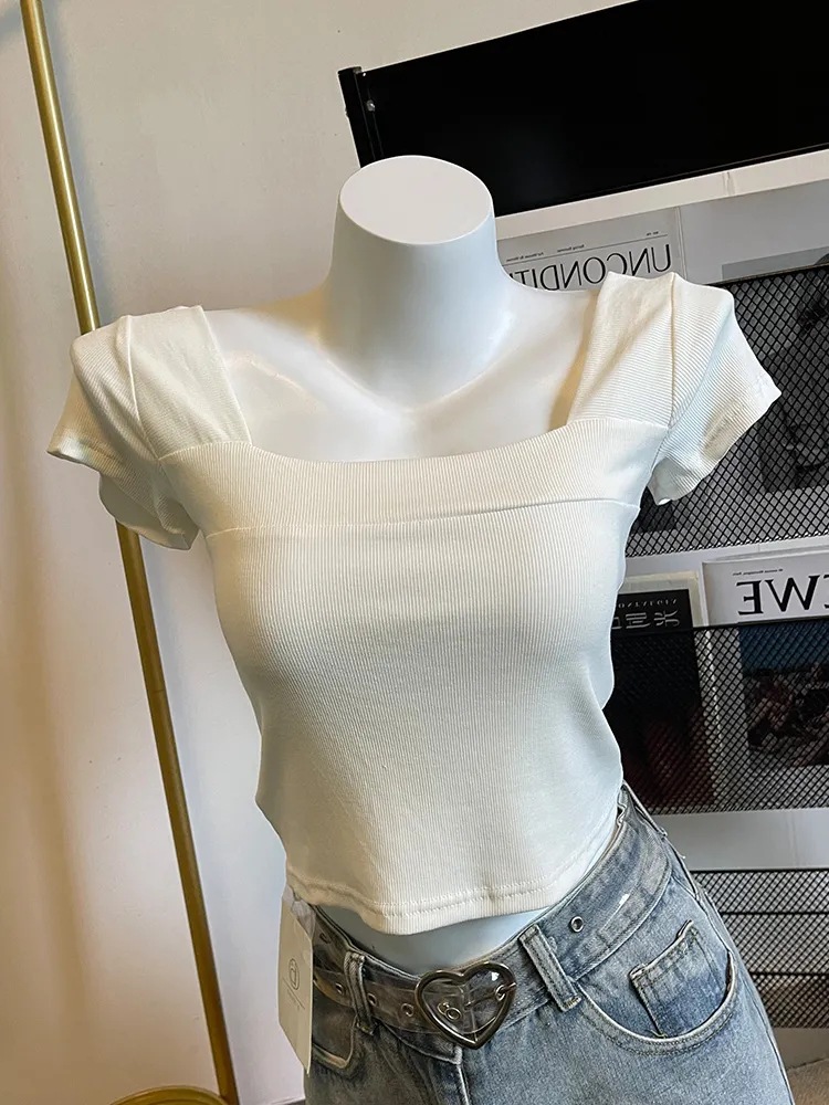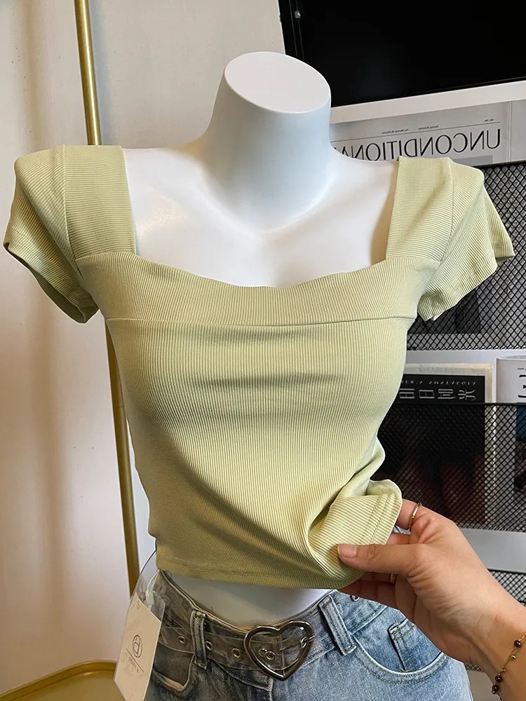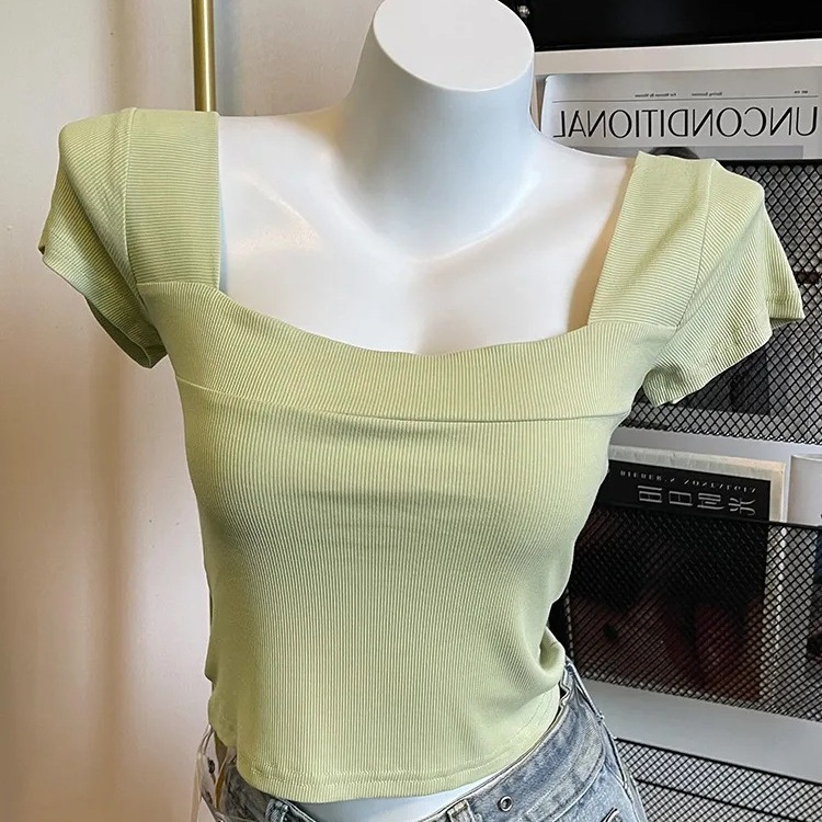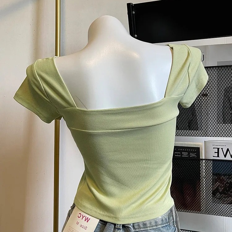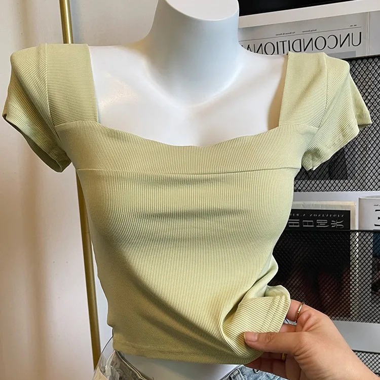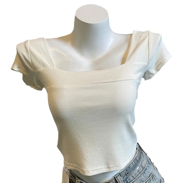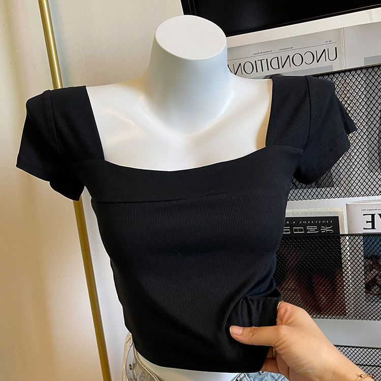 夏季新款欧货气质方领正肩短袖t恤女收腰显瘦韩系短款上衣女