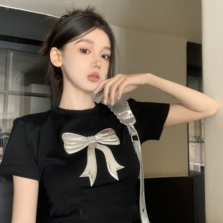 纯欲风辣妹立体蝴蝶结黑色短袖t恤女夏小众修身正肩高腰短款上衣