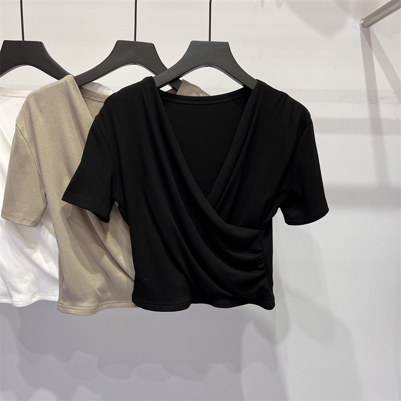 莫代尔夏季气质交叉V领短袖T恤女上衣设计感小众褶皱短款打底衫